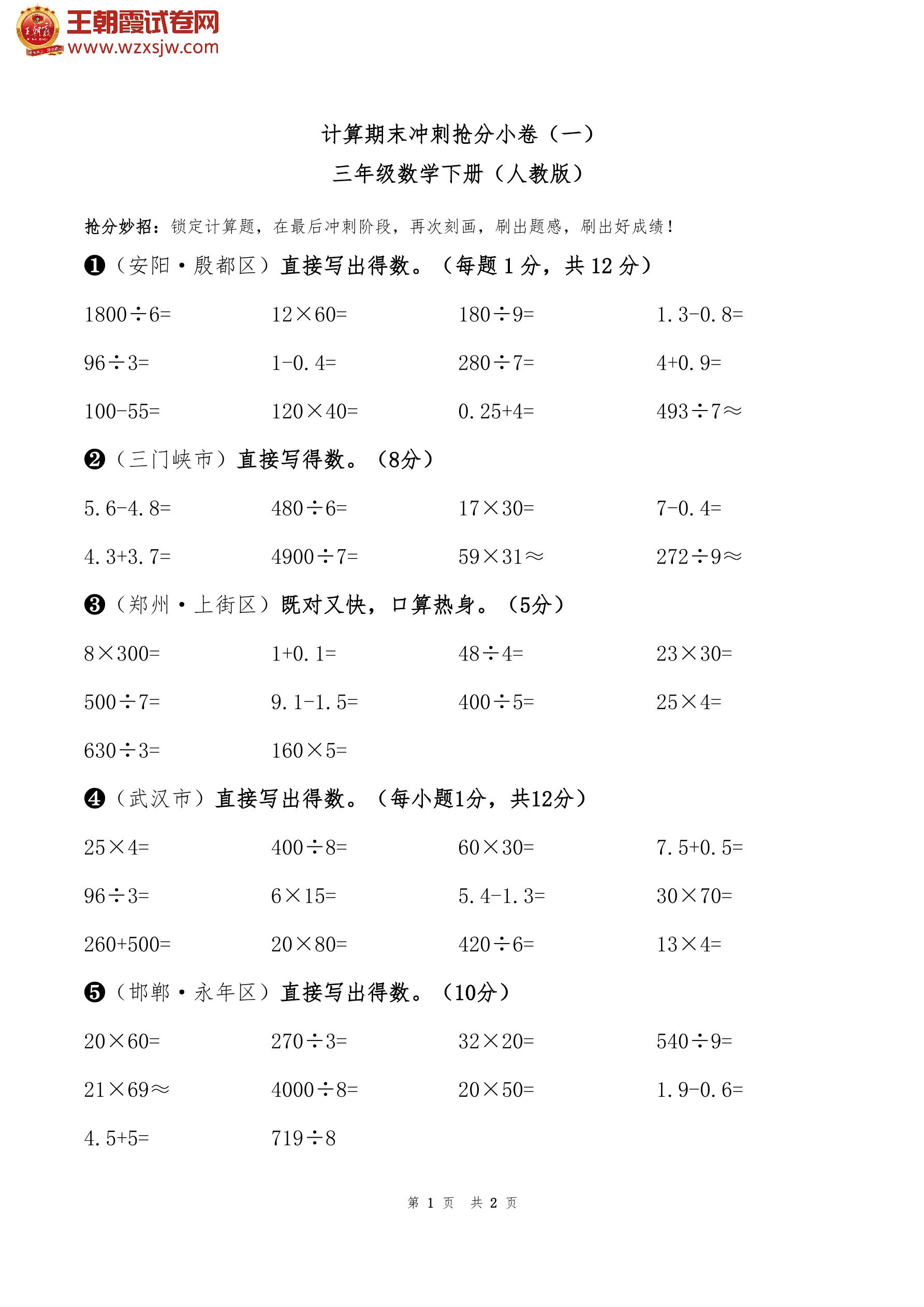 三年级数学下册 计算期末冲刺抢分小卷(一)