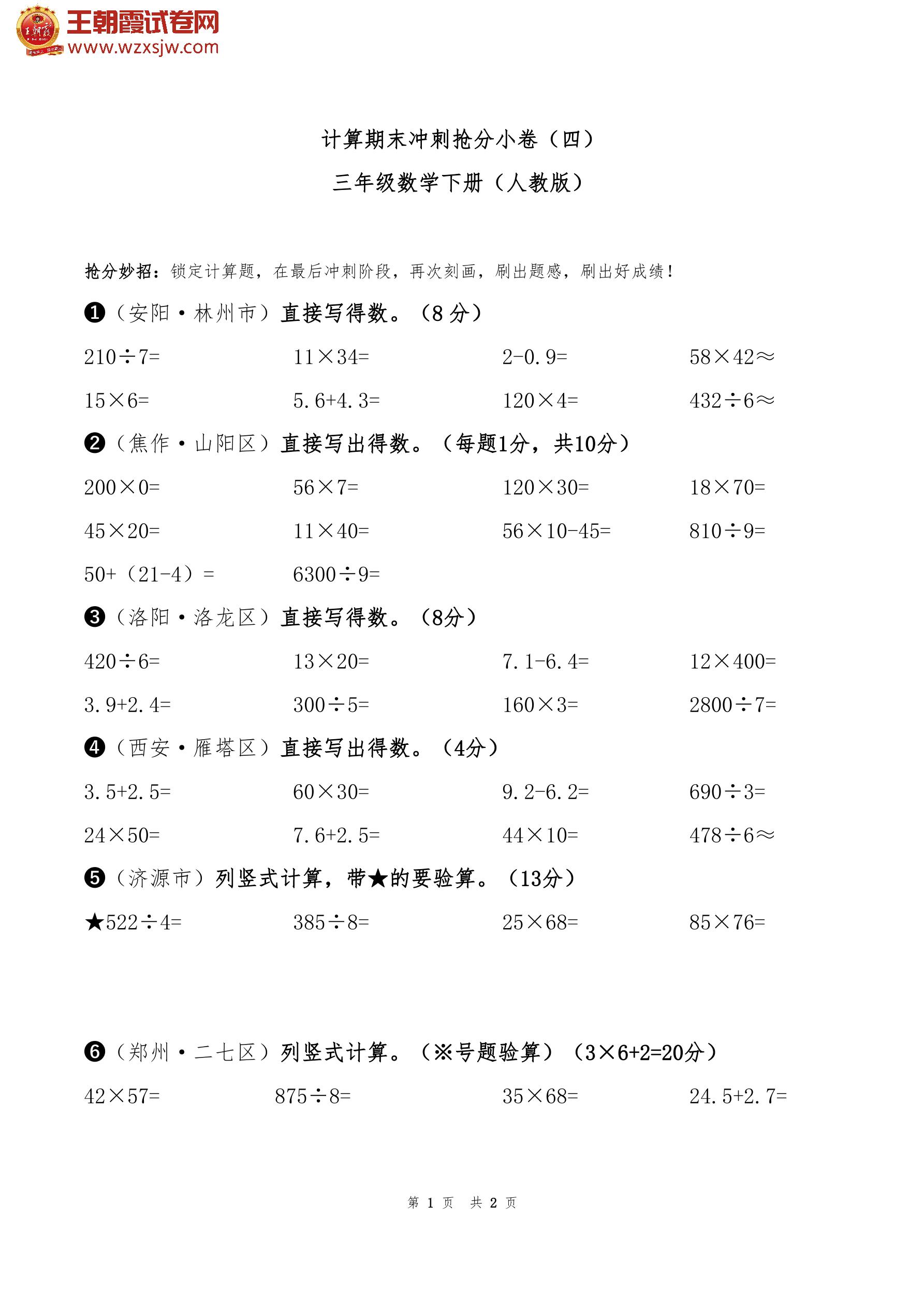 三年级数学下册 计算期末冲刺抢分小卷(四)