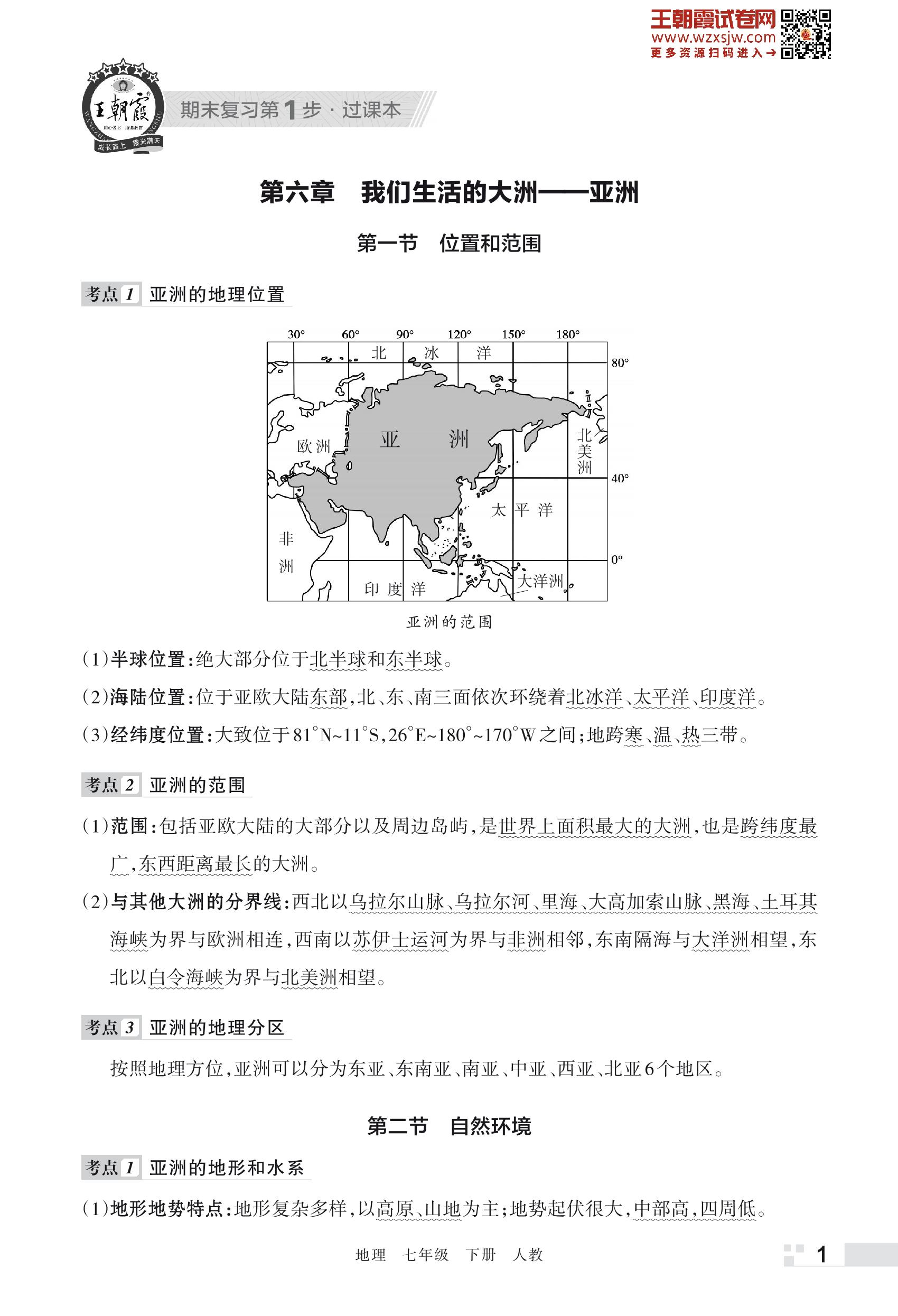 王朝霞期末过课本——第六章 我们生活的大洲:亚洲七年级下册地理(人教版)
