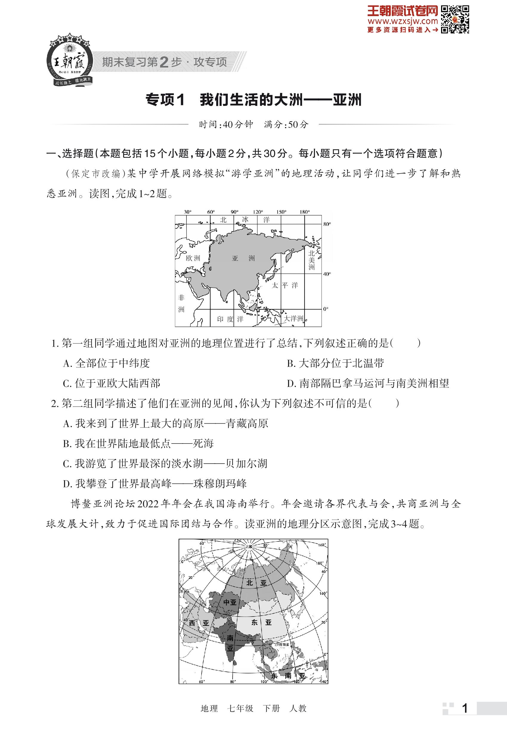 王朝霞期末专项卷——我们生活的大洲:亚洲七年级下册地理(人教版)_R230619091228431【1】