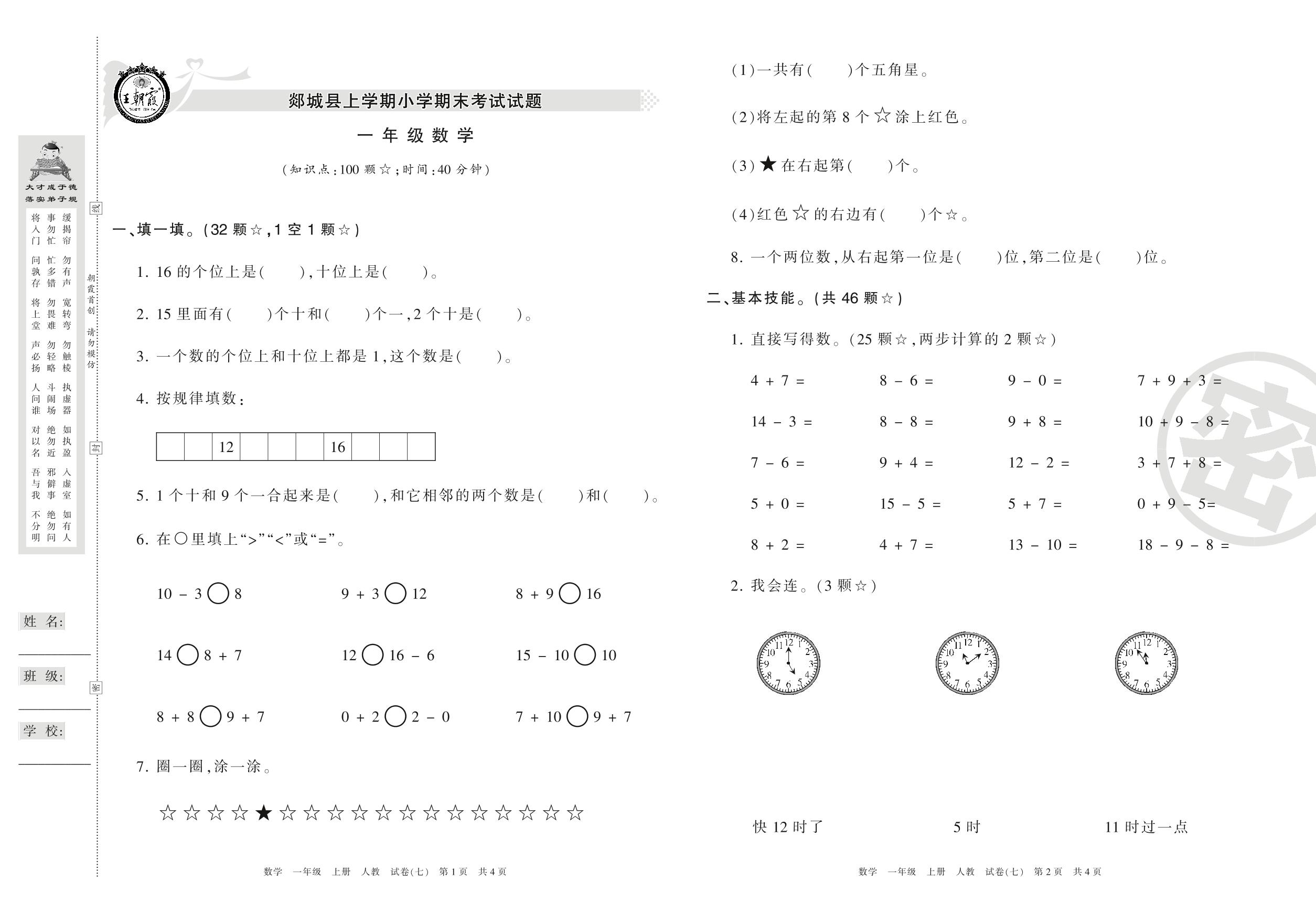 2016-2017学年第一学期临沂市郯城县一年级数学试卷(人教版)【7】