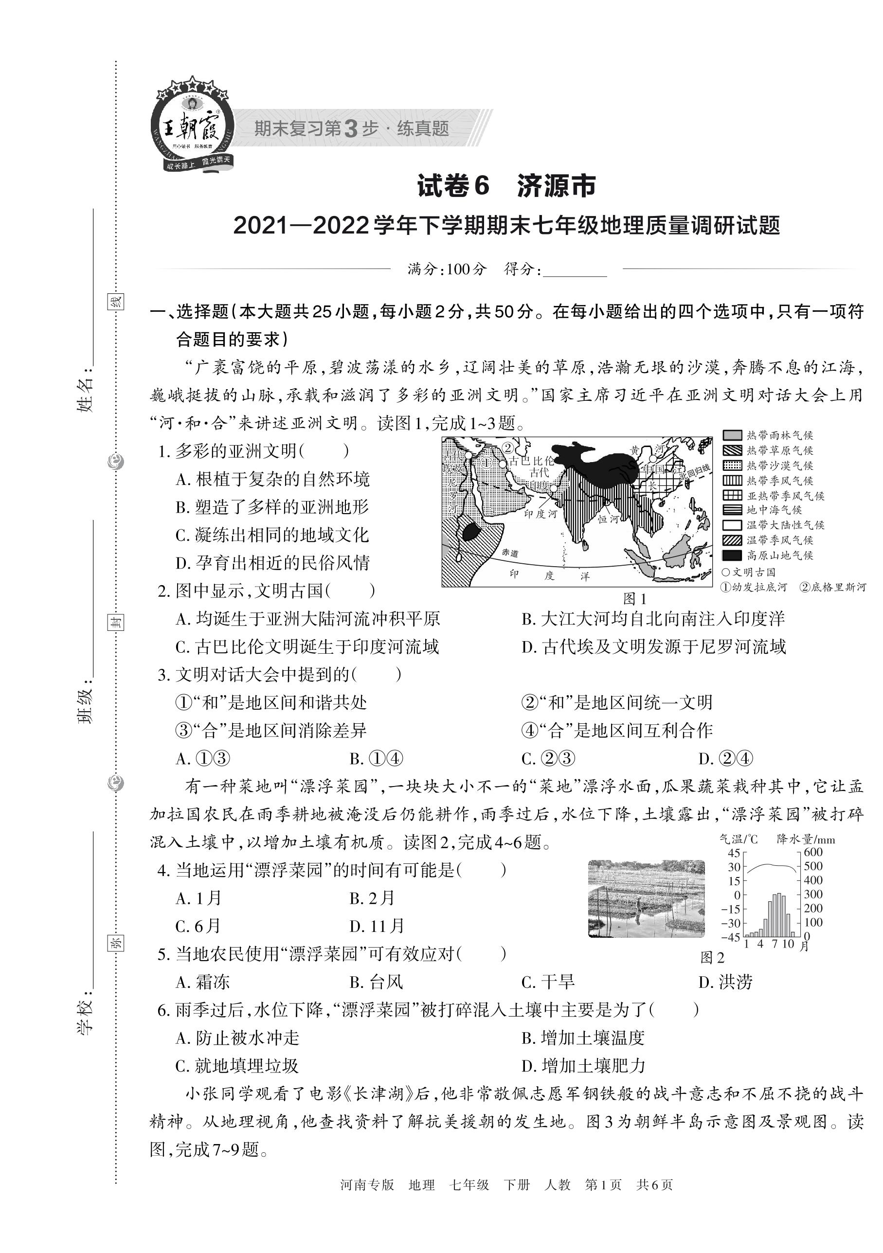 济源市2021—2022学年下学期期末七年级地理质量调研试题(人教版)【6】