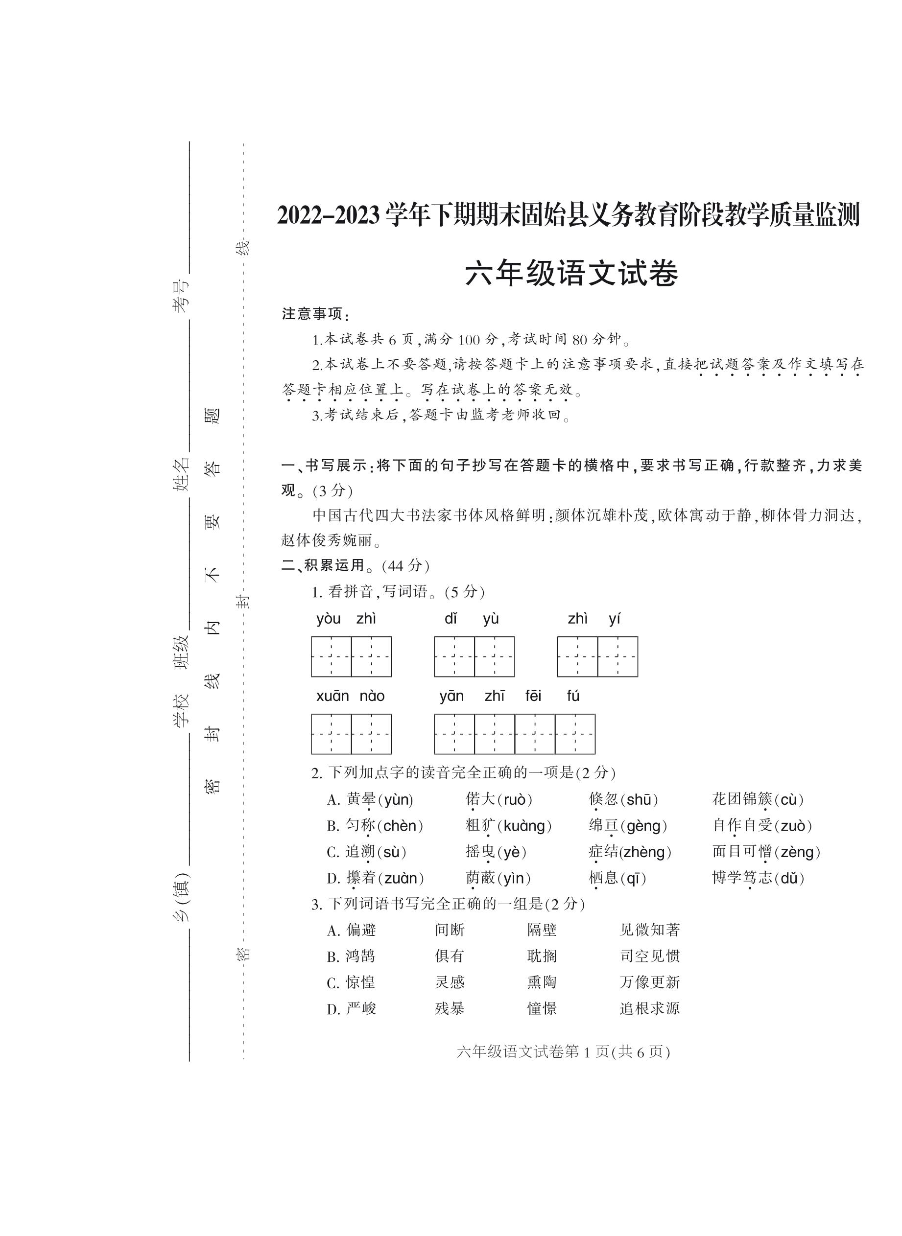 2022-2023学年下期期末固始县义务教育阶段教学质量监测六年级语文试卷(人教版)