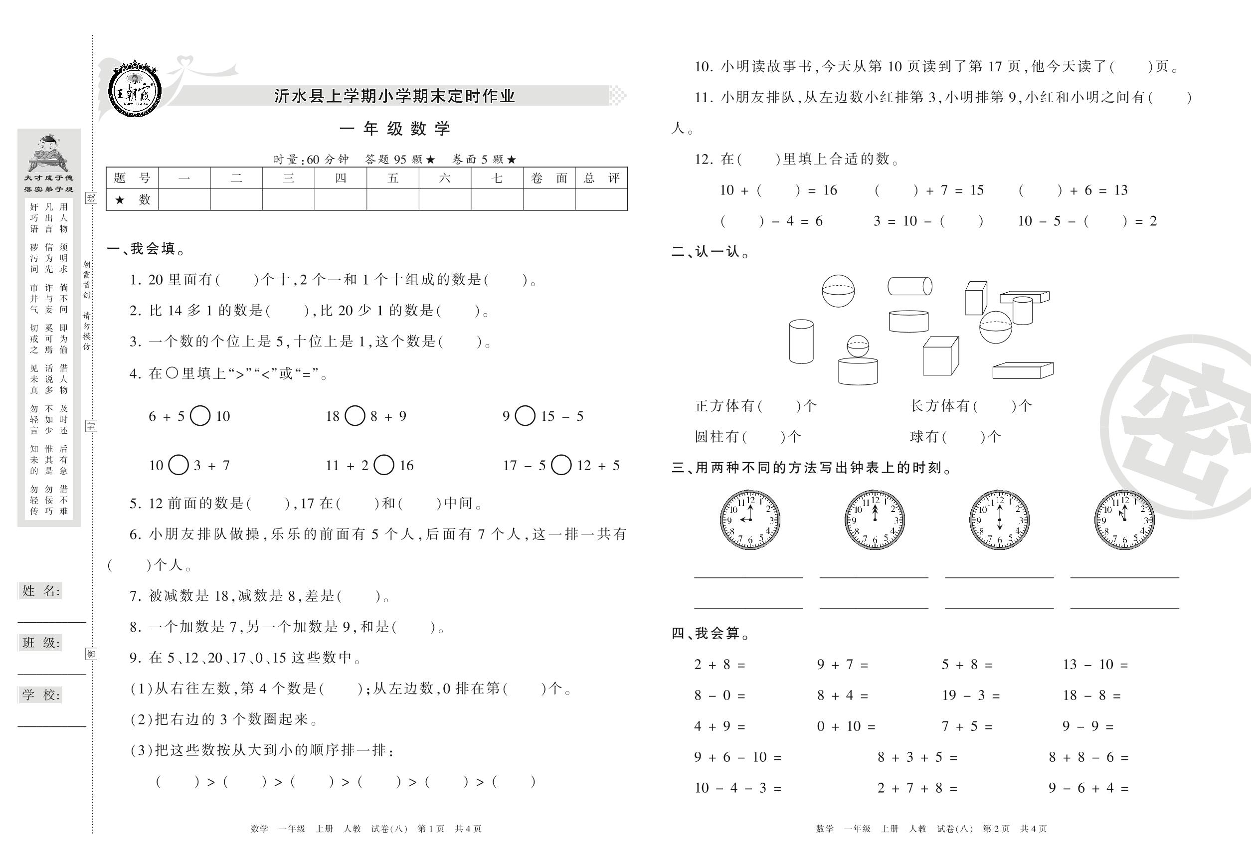 2016-2017学年第一学期临沂市沂水县一年级数学试卷(人教版)【8】
