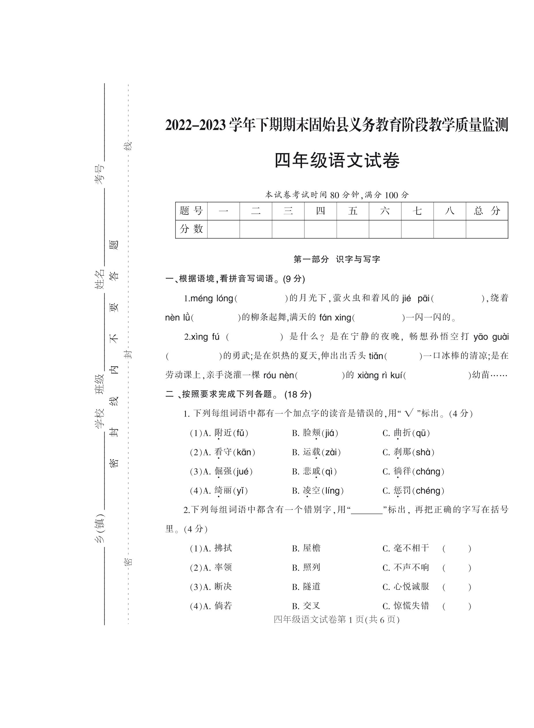 2022-2023学年下期期末固始县义务教育阶段教学质量监测四年级语文试卷(人教版)