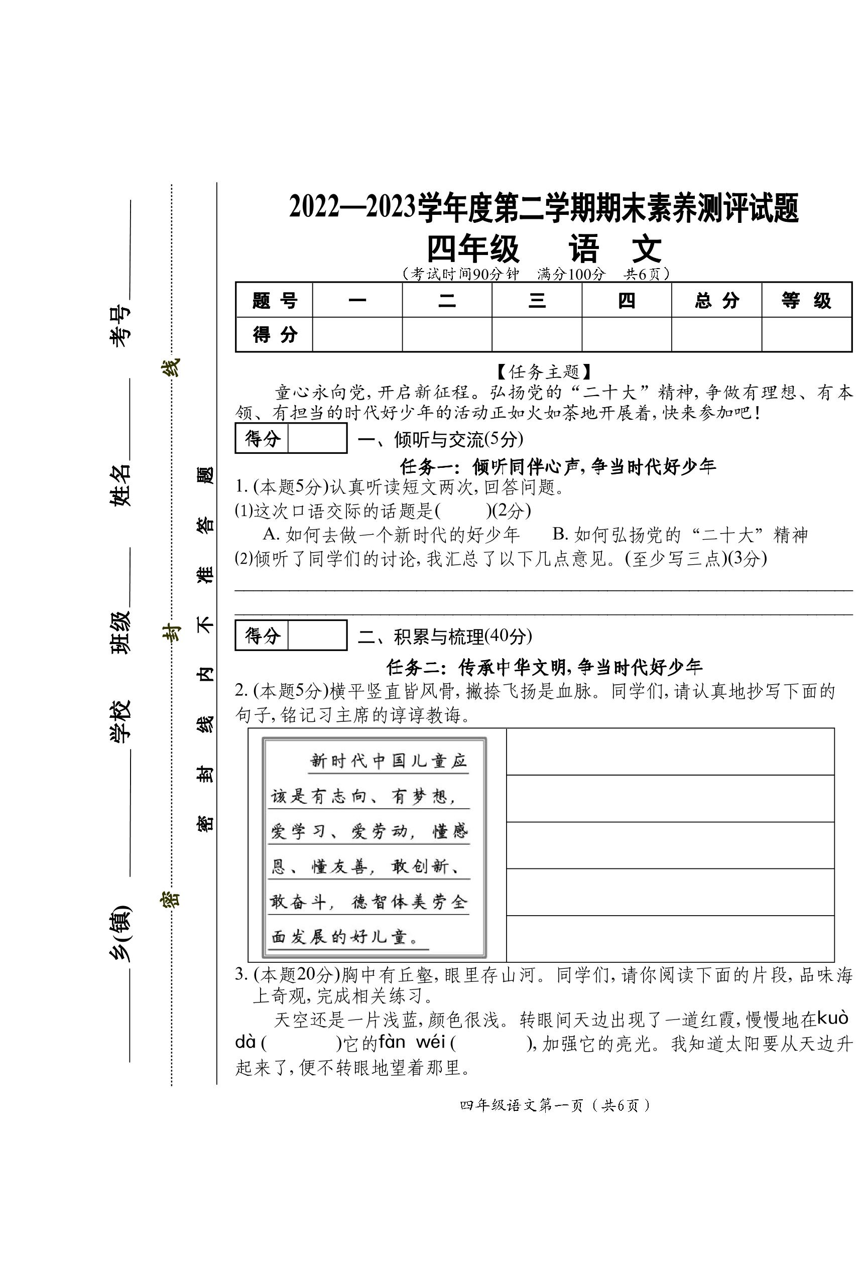 山西省晋中市祁县2022-2023学年度第二学期期末素养测评题四年级语文(人教版)