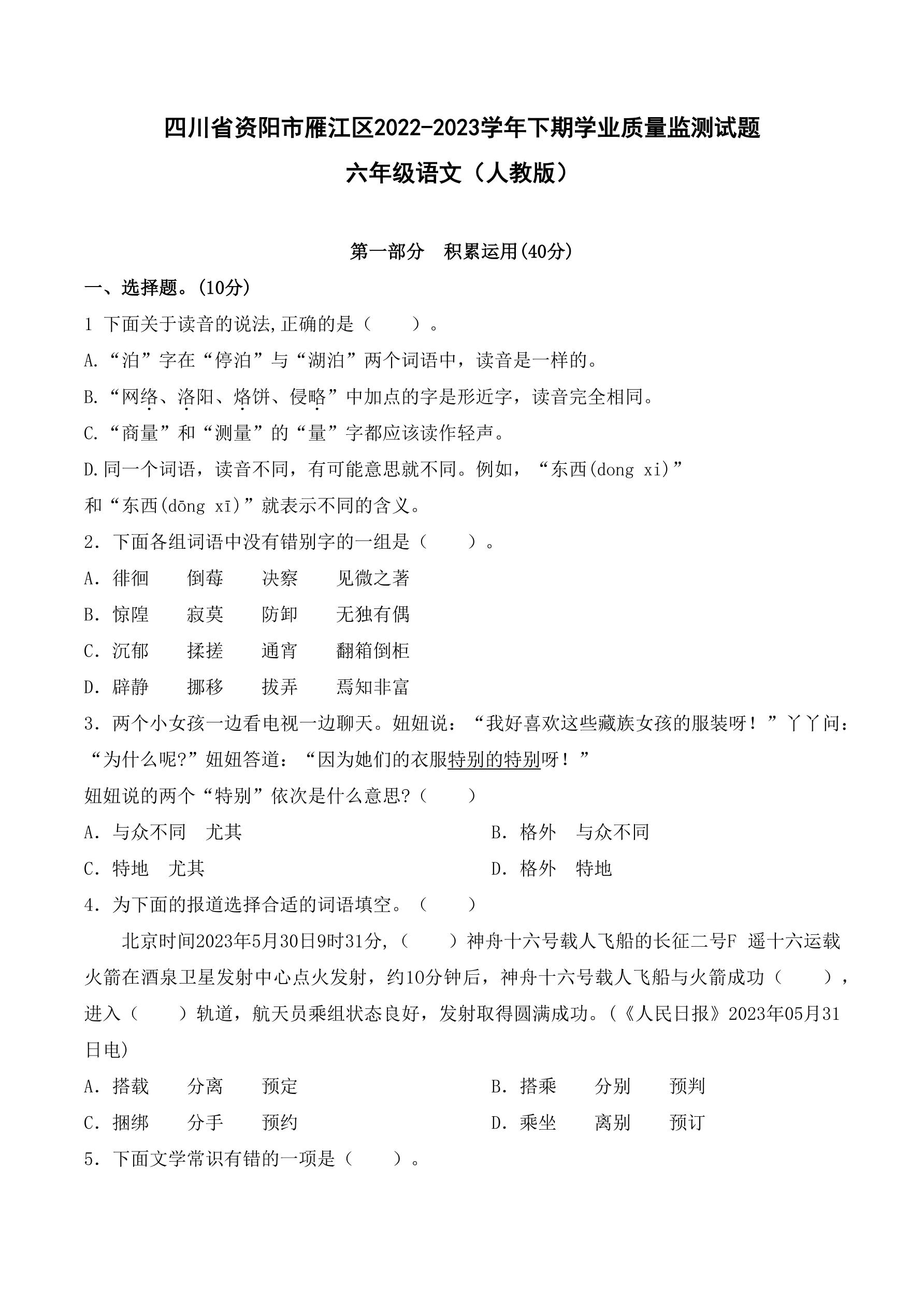四川省资阳市雁江区2022-2023学年下期期末学业质量监测试题六年级语文(人教版)