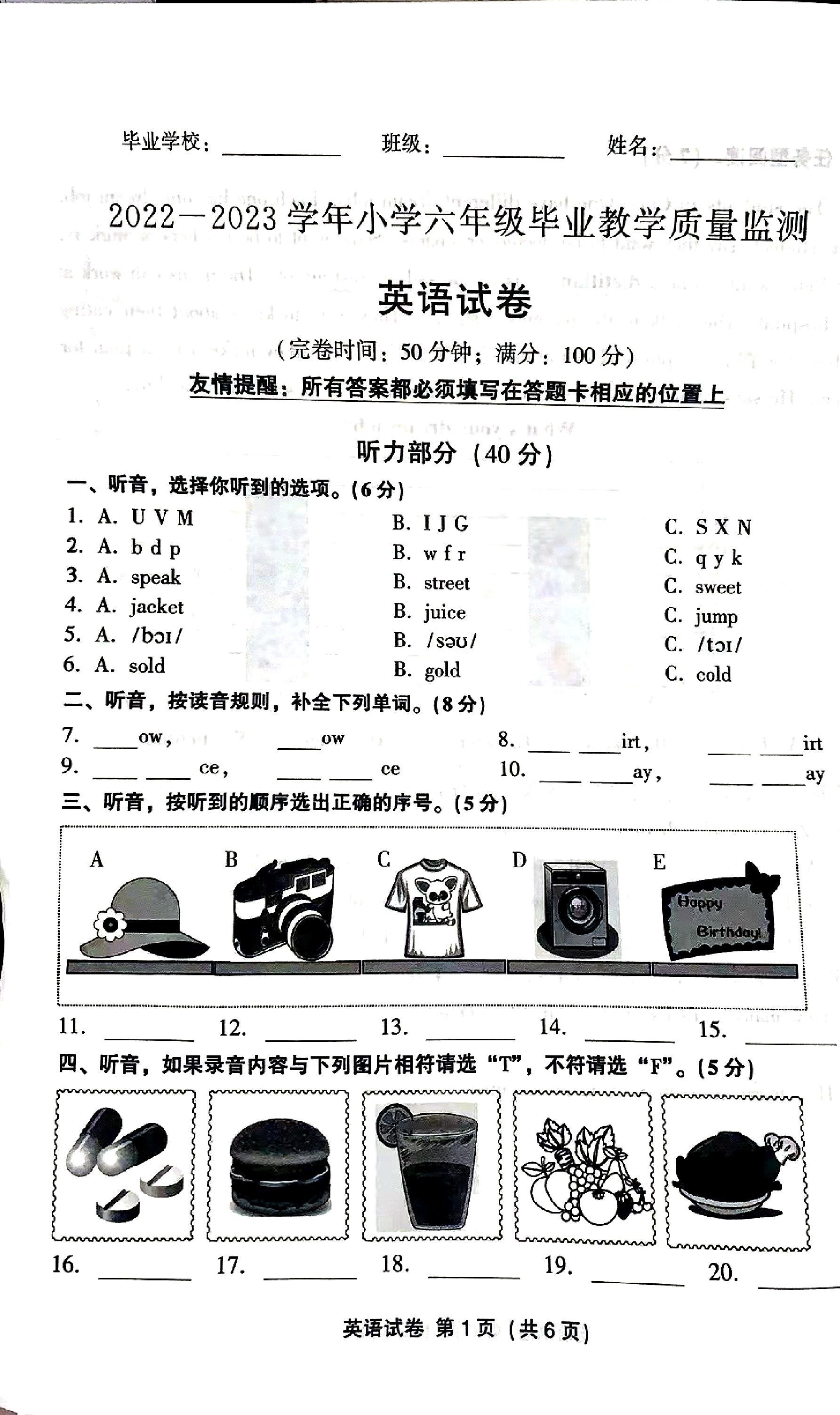 福建省福州市2022-2023学年毕业教学质量监测试卷六年级英语