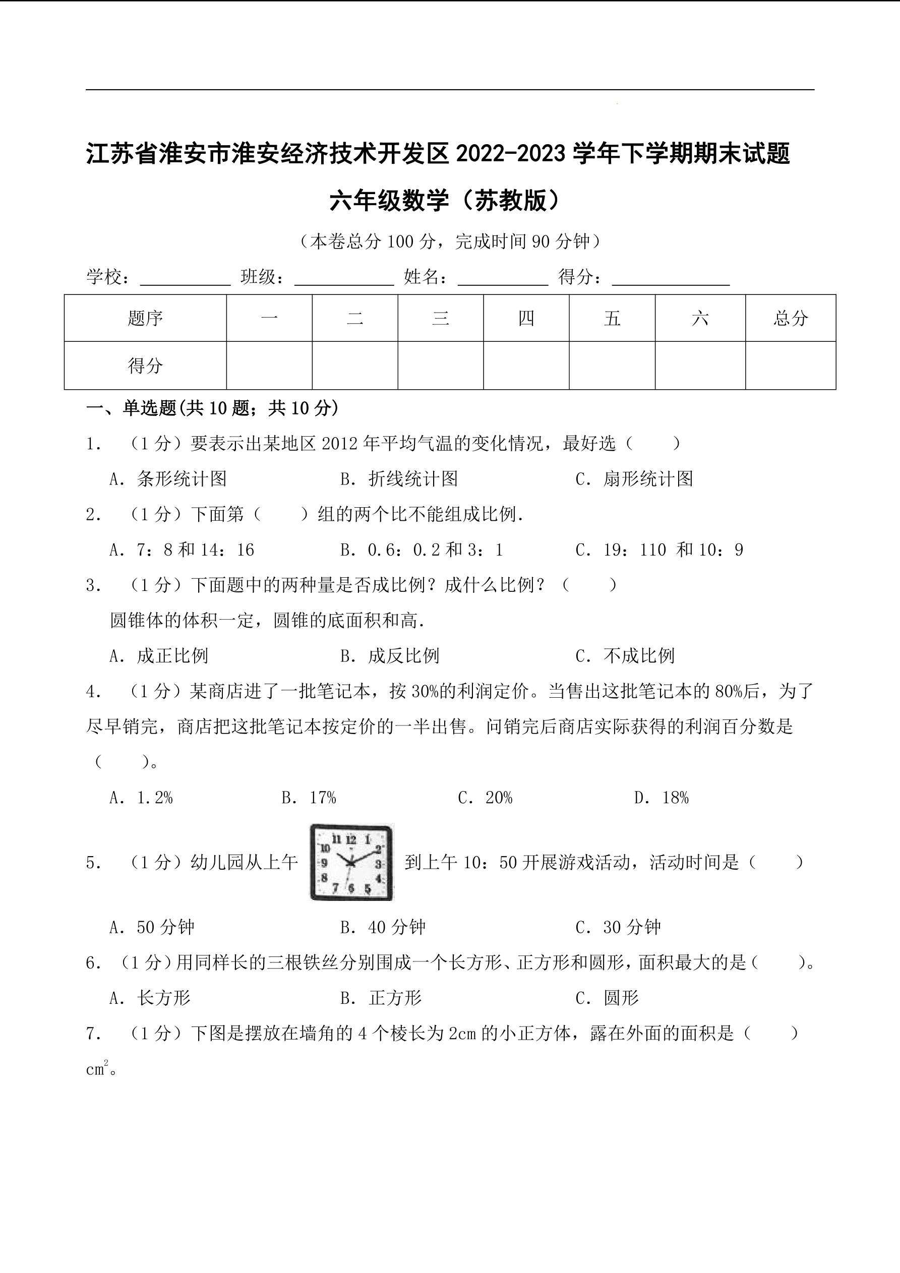 江苏省淮安市淮安经济技术开发区2022-2023学年下学期期末试题六年级数学(苏教版)