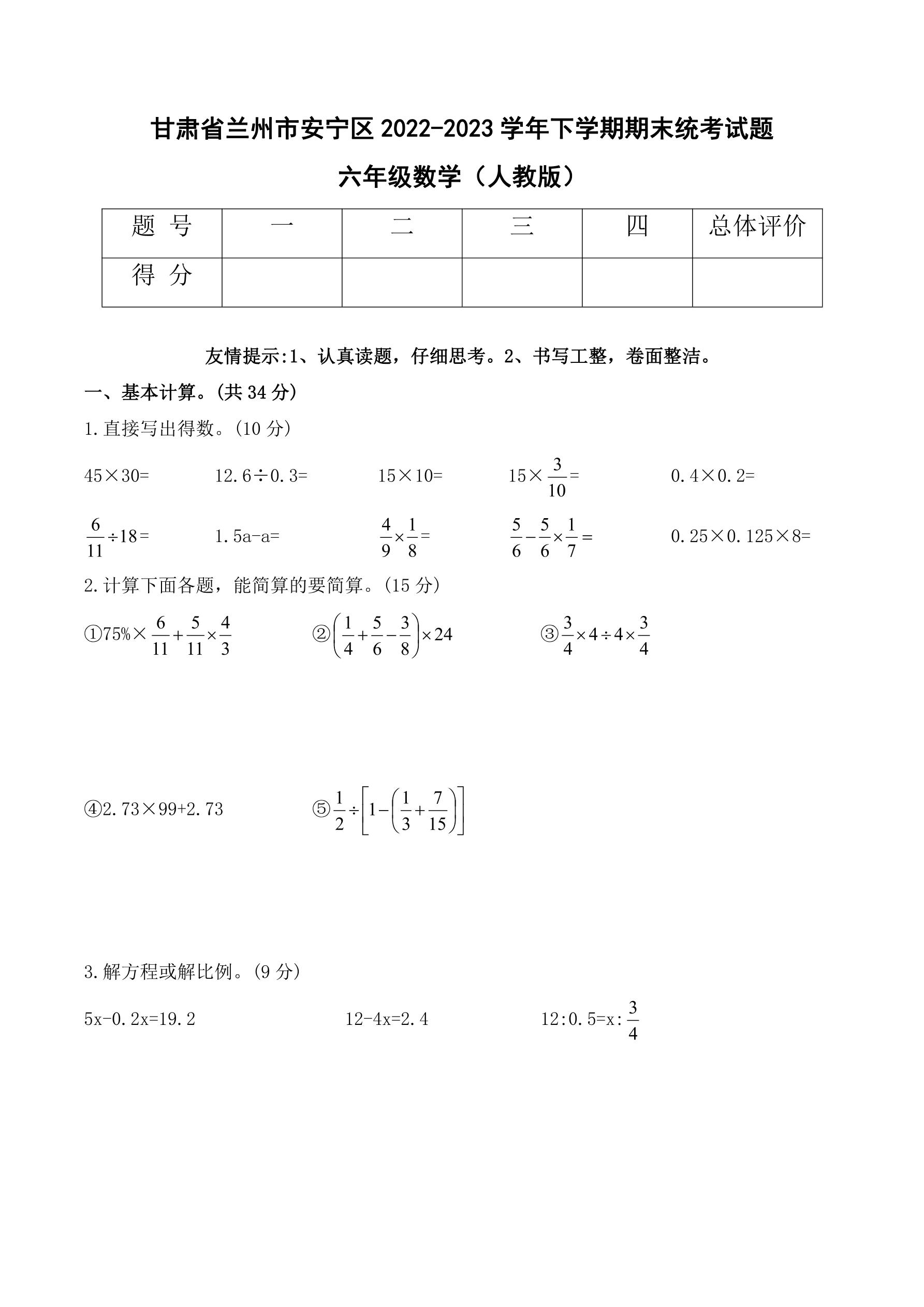甘肃省兰州市安宁区2022-2023学年下学期期末统考试题六年级数学(人教版)