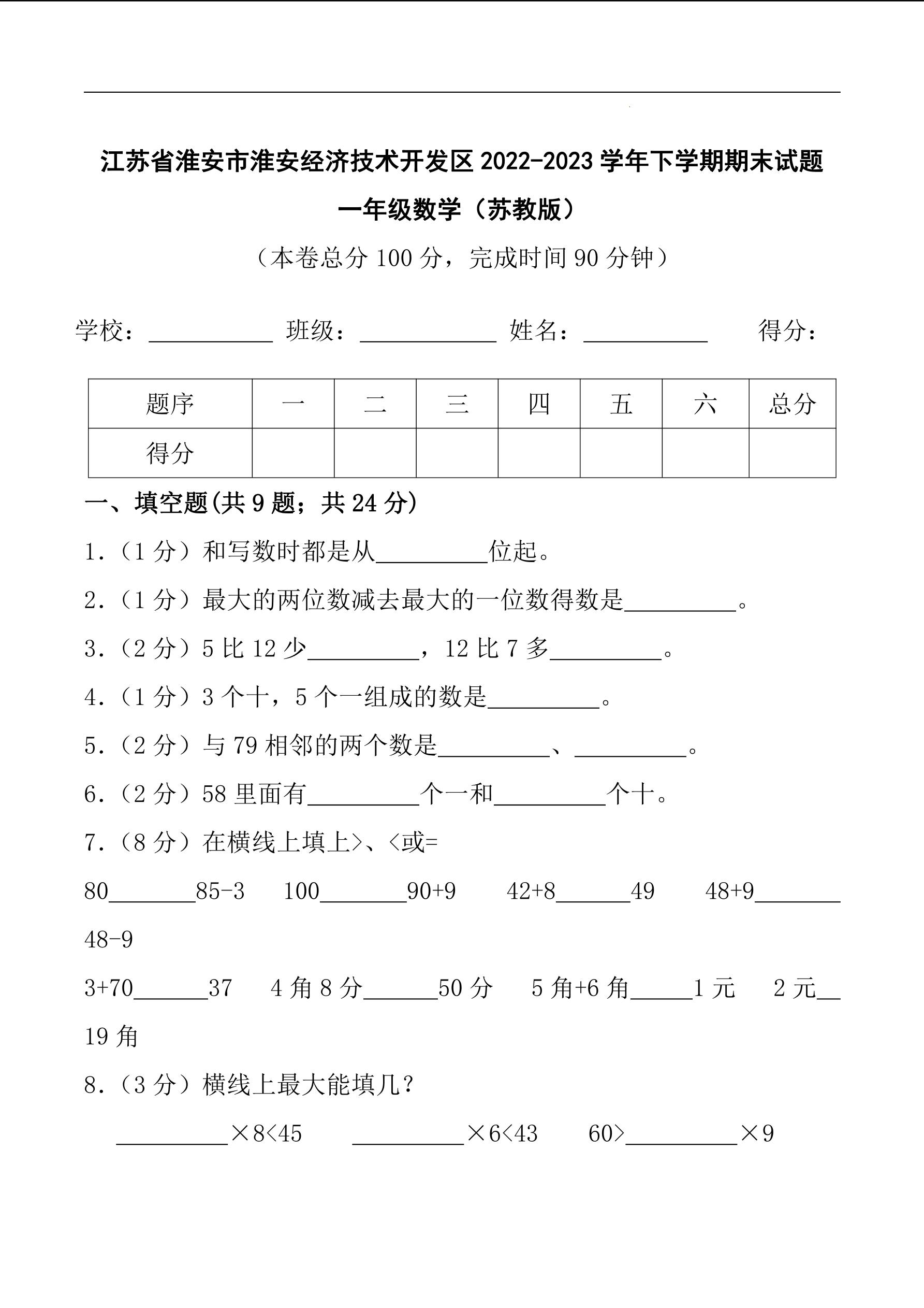 江苏省淮安市淮安经济技术开发区2022-2023学年下学期期末试题一年级数学(苏教版)