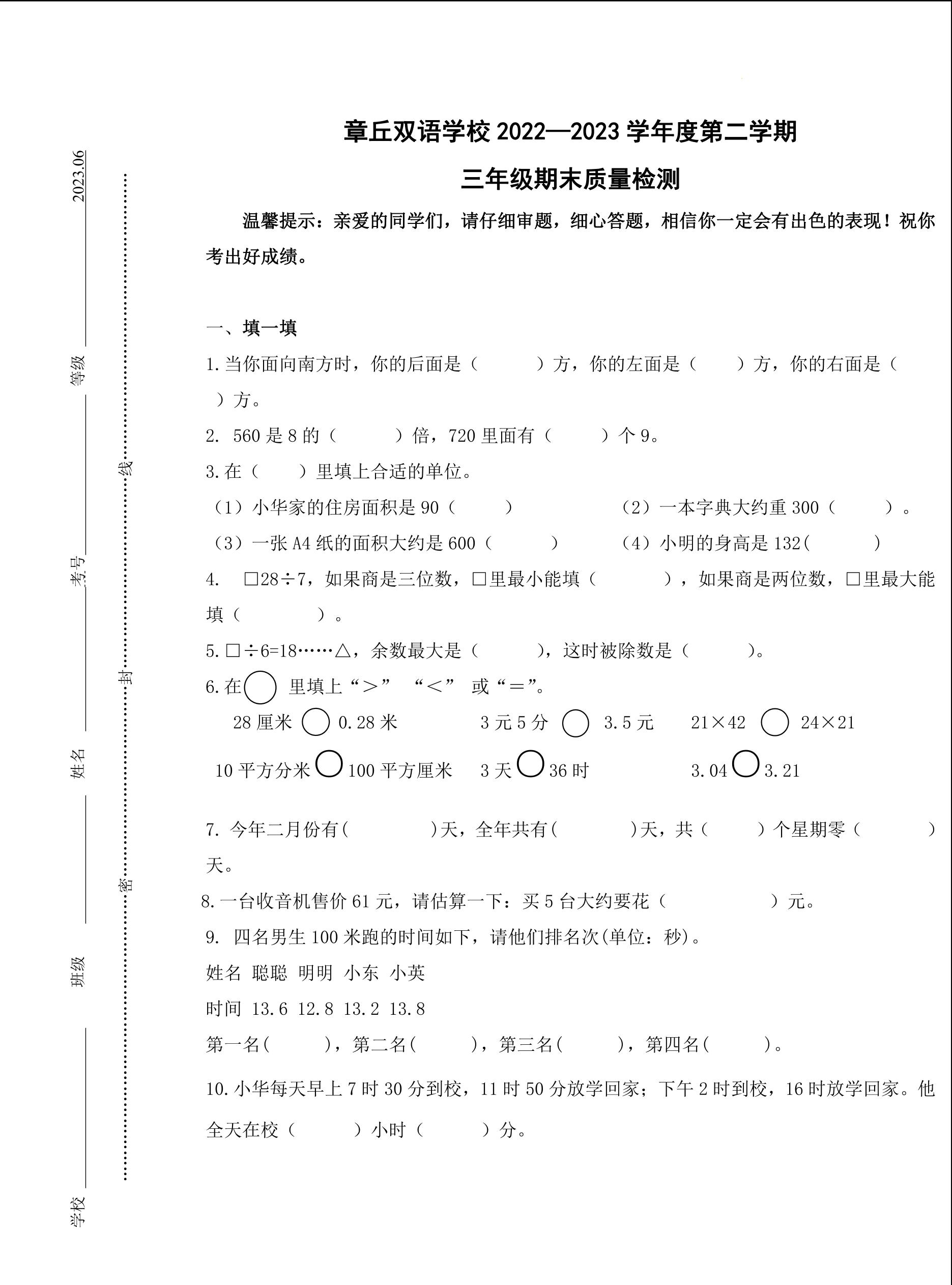山东省济南市章丘双语学校2022-2023学年第二学期期末质量检测三年级数学(人教版)
