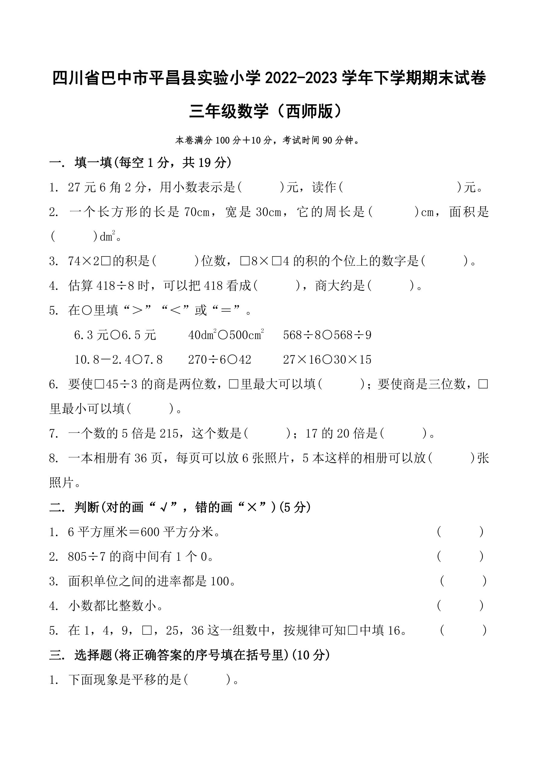 四川省巴中市平昌县实验小学2022-2023学年下学期期末试卷三年级数学(西师版)