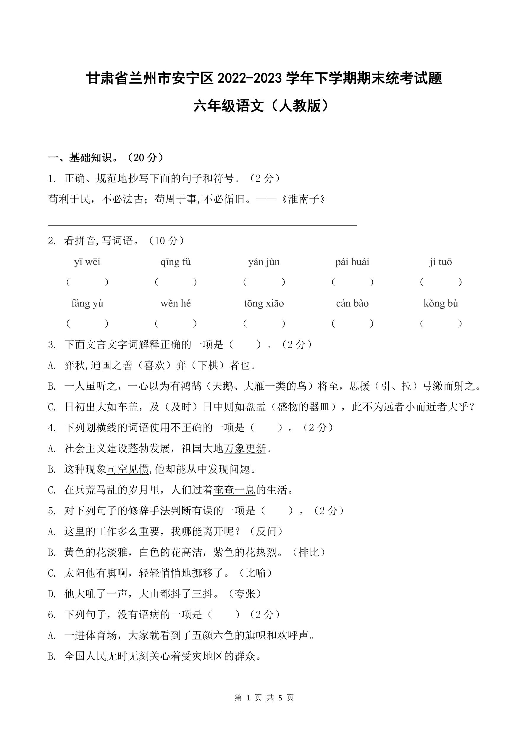 甘肃省兰州市安宁区2022-2023学年下学期期末统考试题六年级语文(人教版)