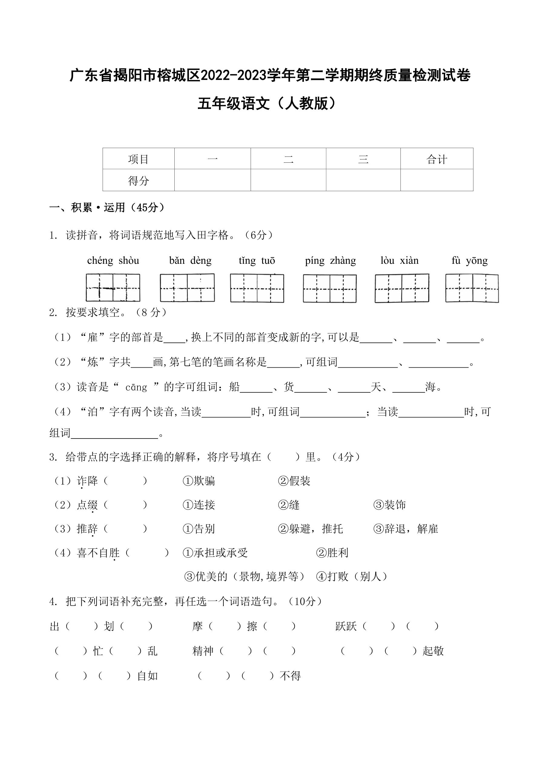 广东省揭阳市榕城区2022-2023学年第二学期期终质量检测试卷五年级语文(人教版)