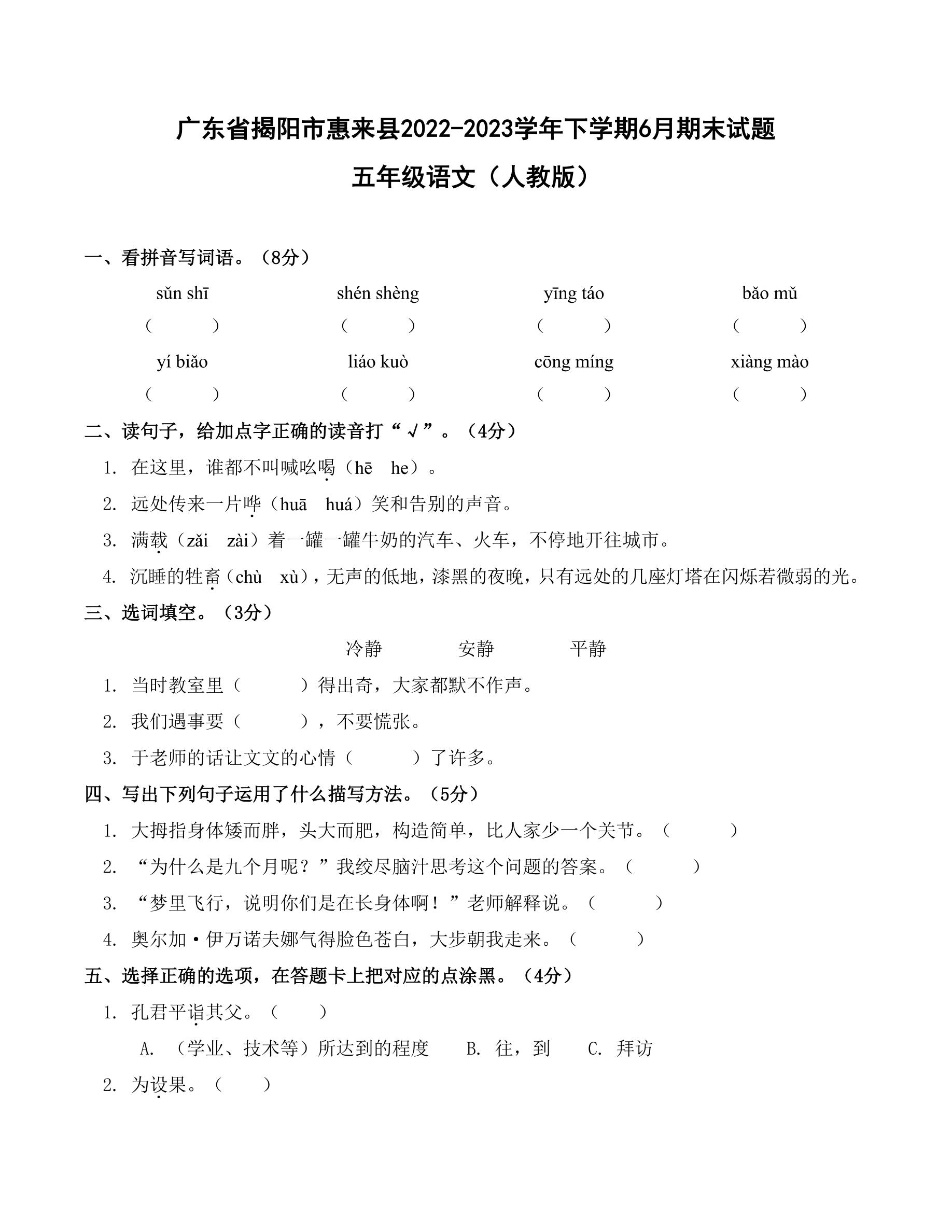 广东省揭阳市惠来县2022-2023学年下学期6月期末试题五年级语文(人教版)