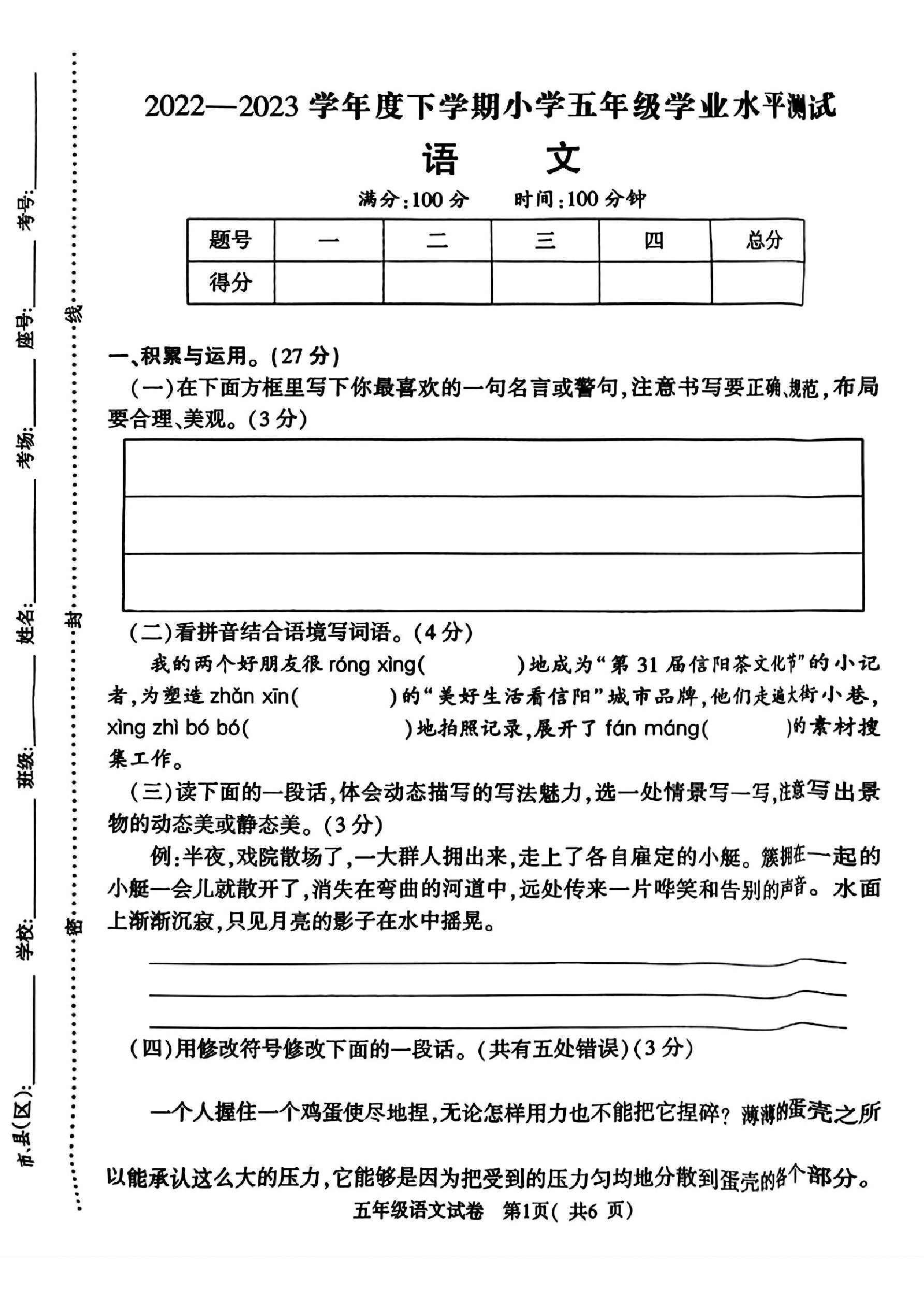 河南省信阳市浉河区2022-2023学年下学期期末考试试题五年级语文(人教版)