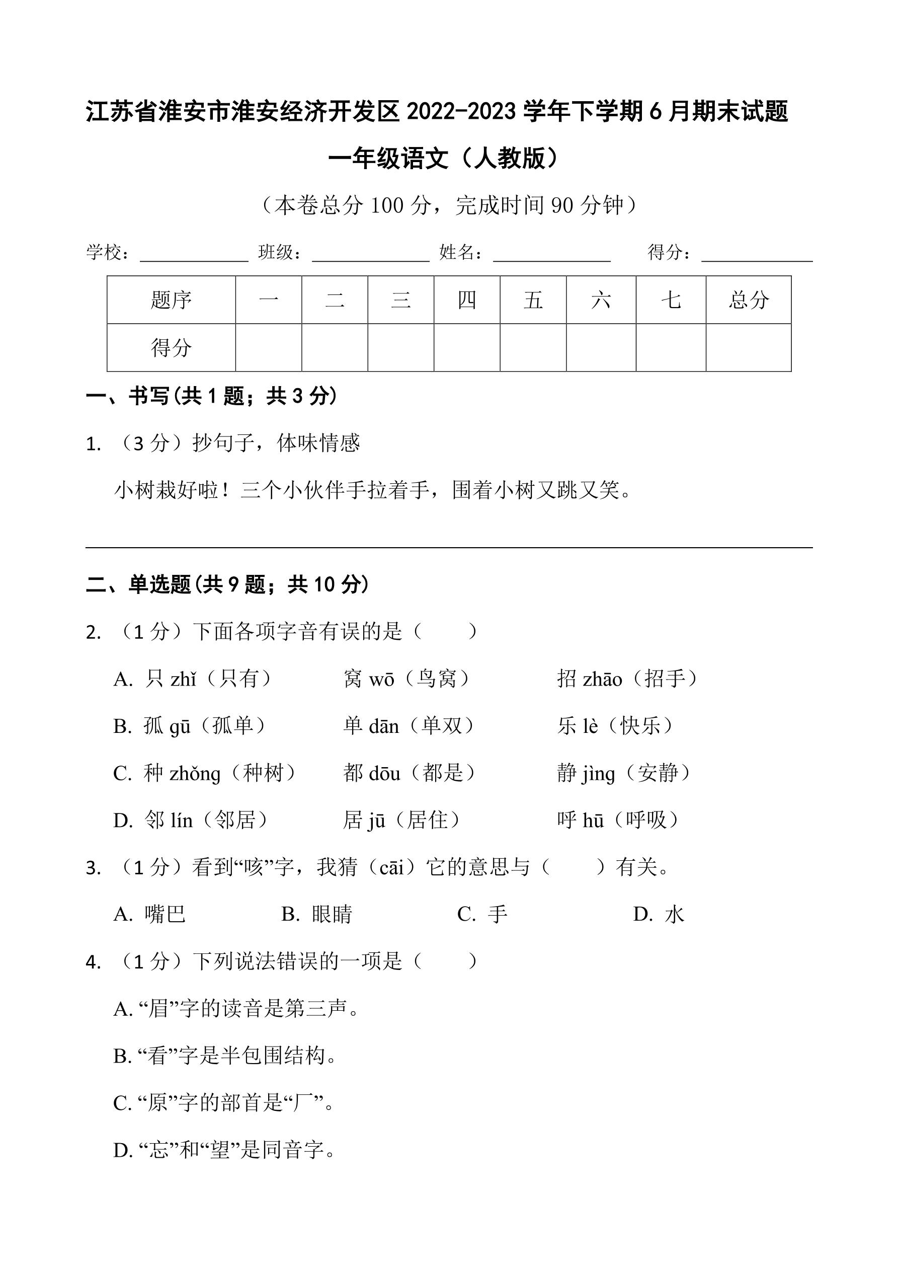 江苏省淮安市淮安经济开发区2022-2023学年下学期6月期末试题一年级语文(人教版)