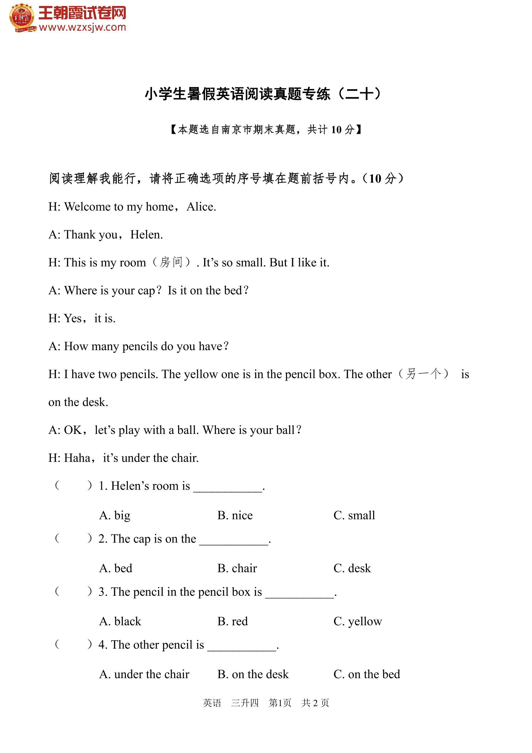 【三升四】小学生暑假英语阅读真题专练(二十)