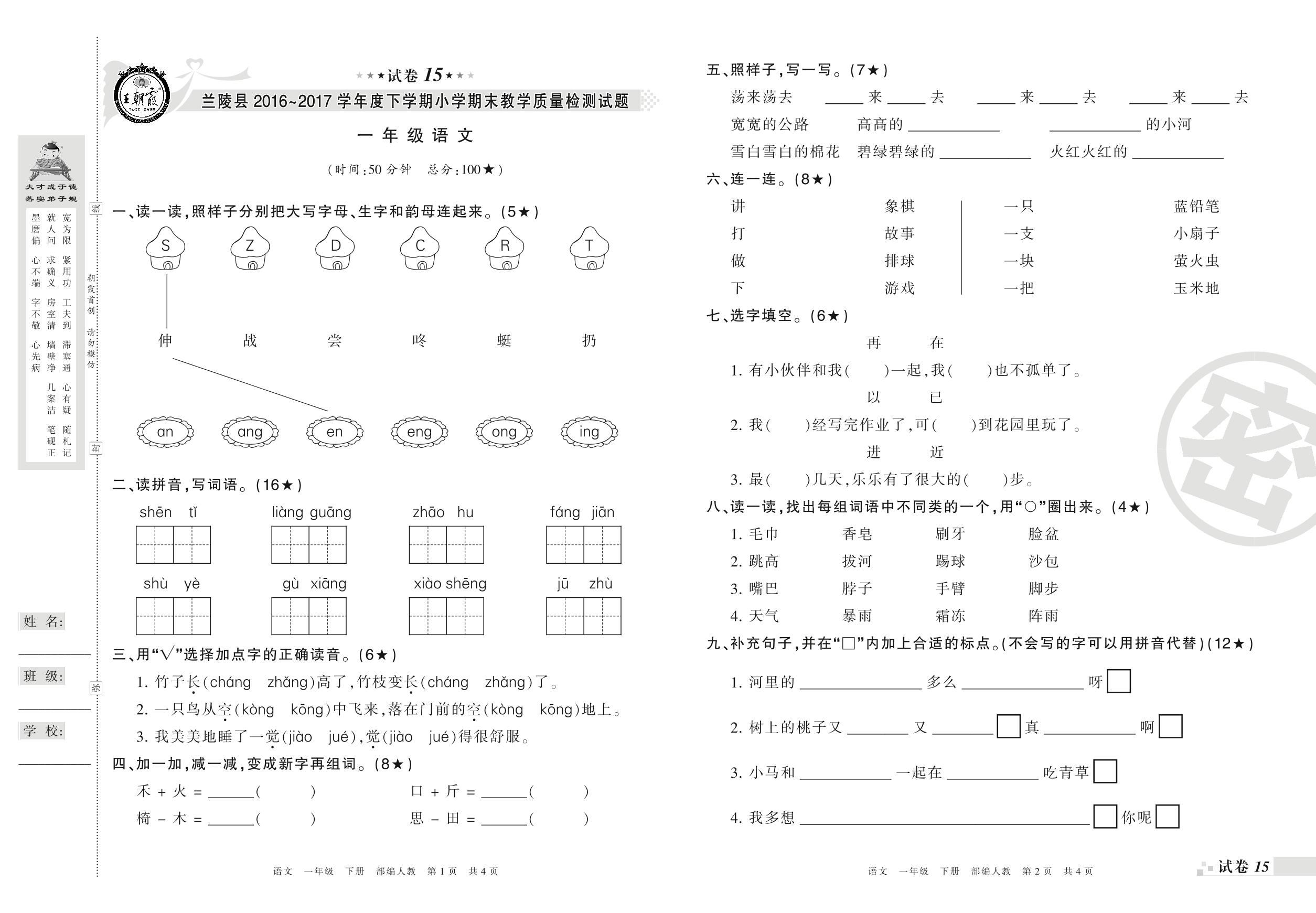 2016-2017学年第二学期临沂市兰陵县一年级语文试卷(人教版)【15】