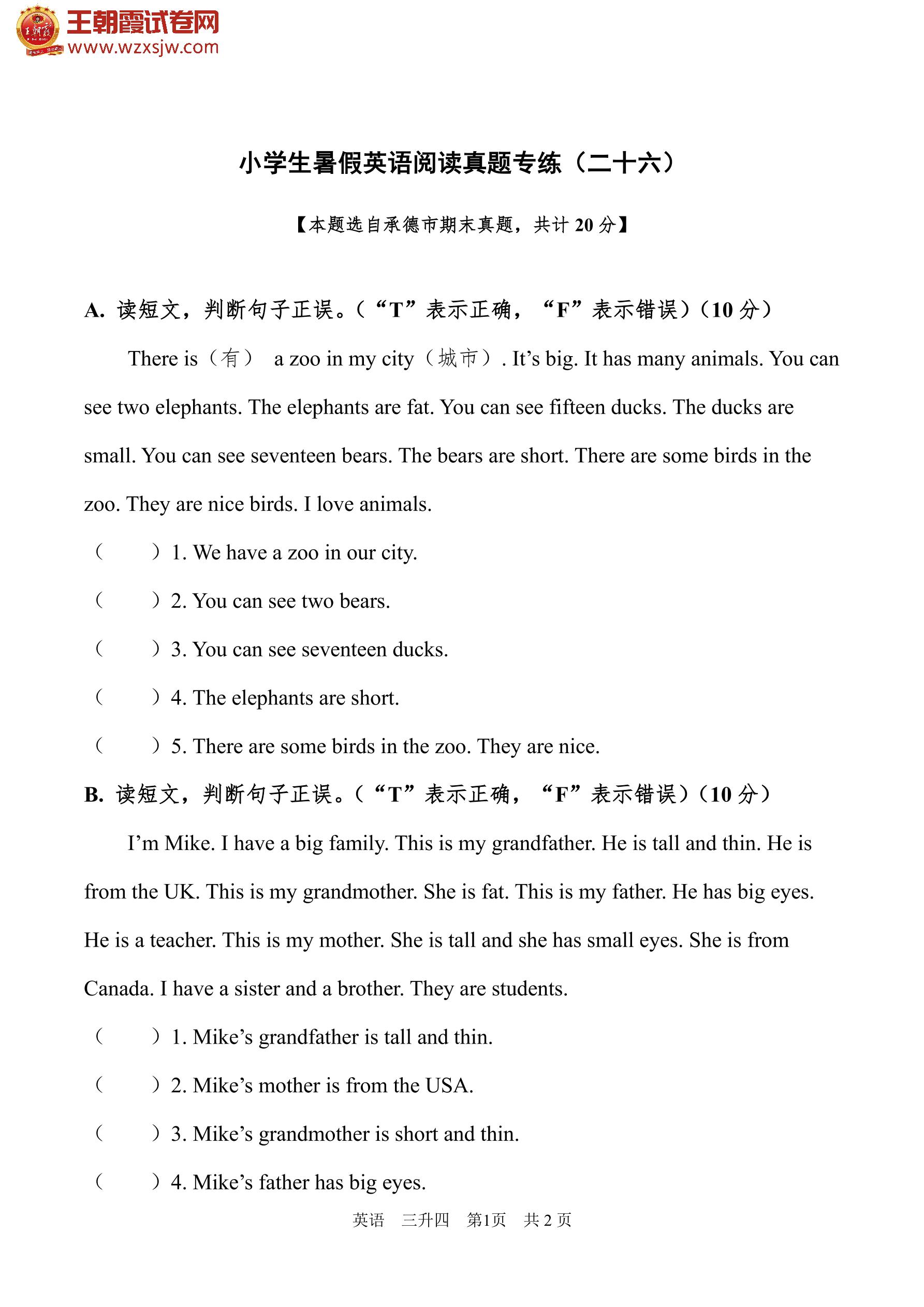 【三升四】小学生暑假英语阅读真题专练(二十六)