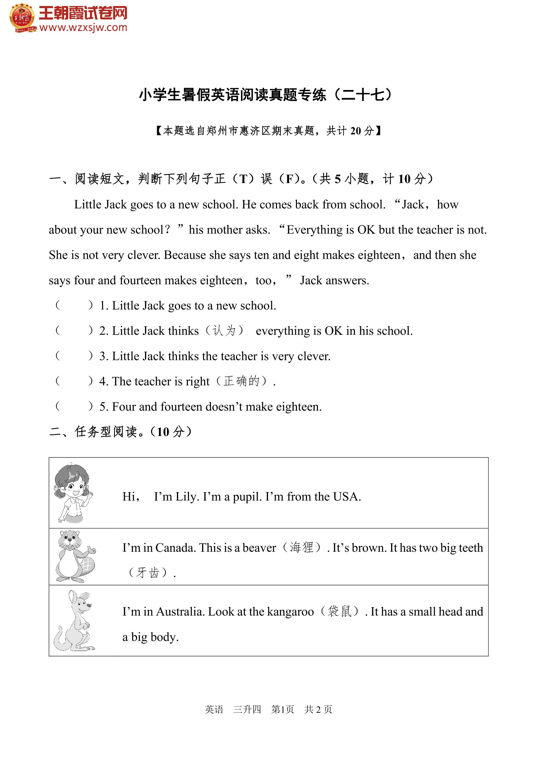 【三升四】小学生暑假英语阅读真题专练(二十七)