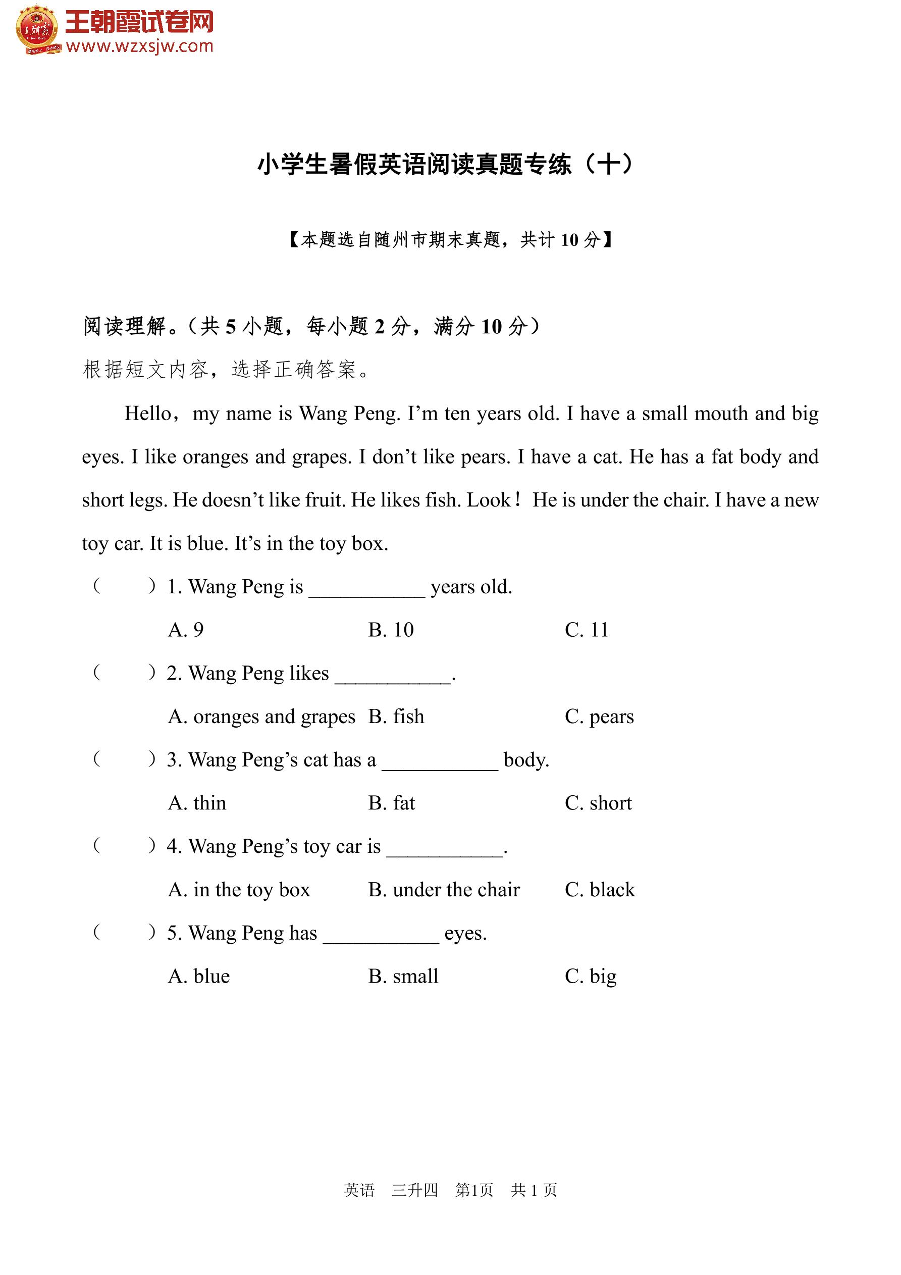 【三升四】小学生暑假英语阅读真题专练(十)