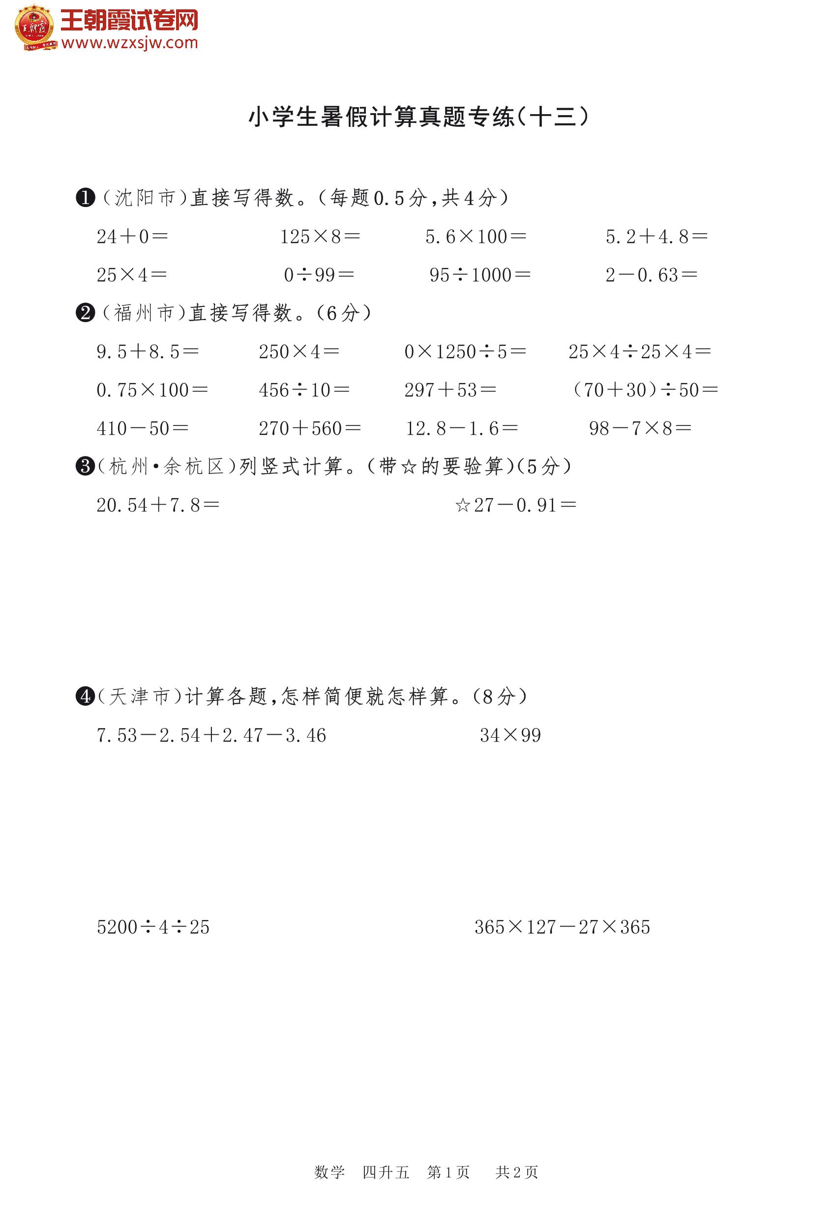 【四升五】小学生暑假计算真题专练(十三)
