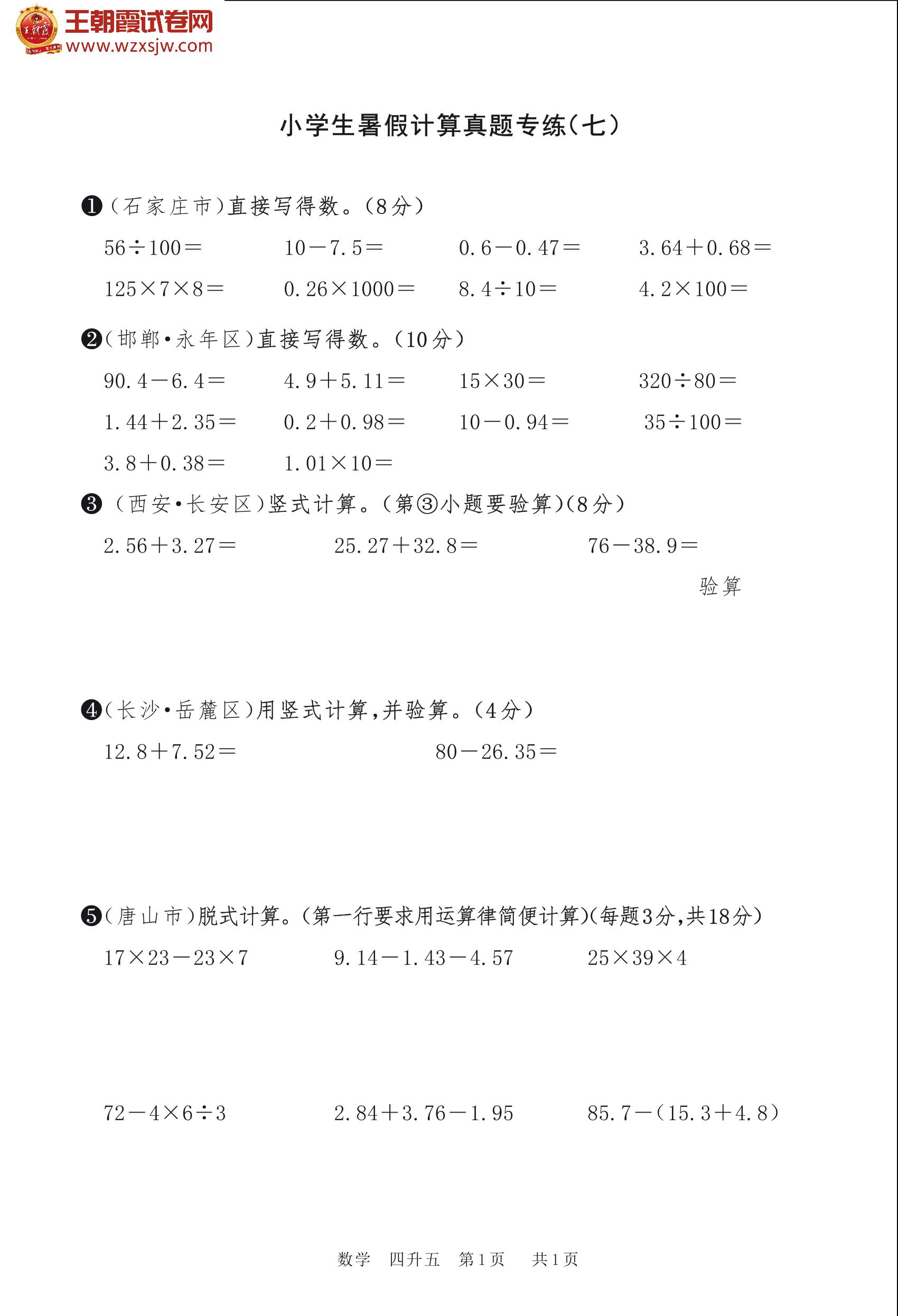 【四升五】小学生暑假计算真题专练(七)