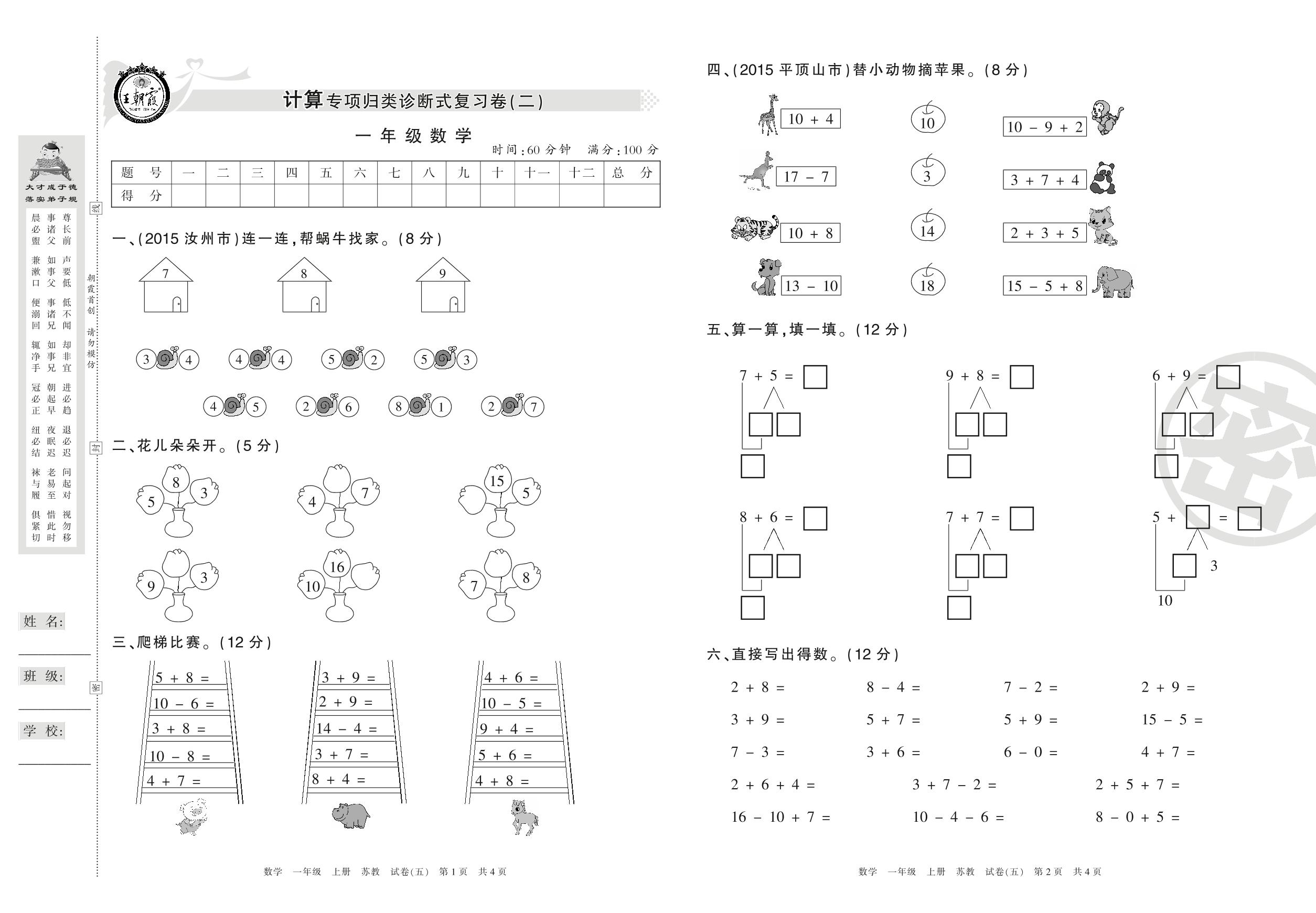 王朝霞期末专项卷一年级上册数学(苏教版)【5】