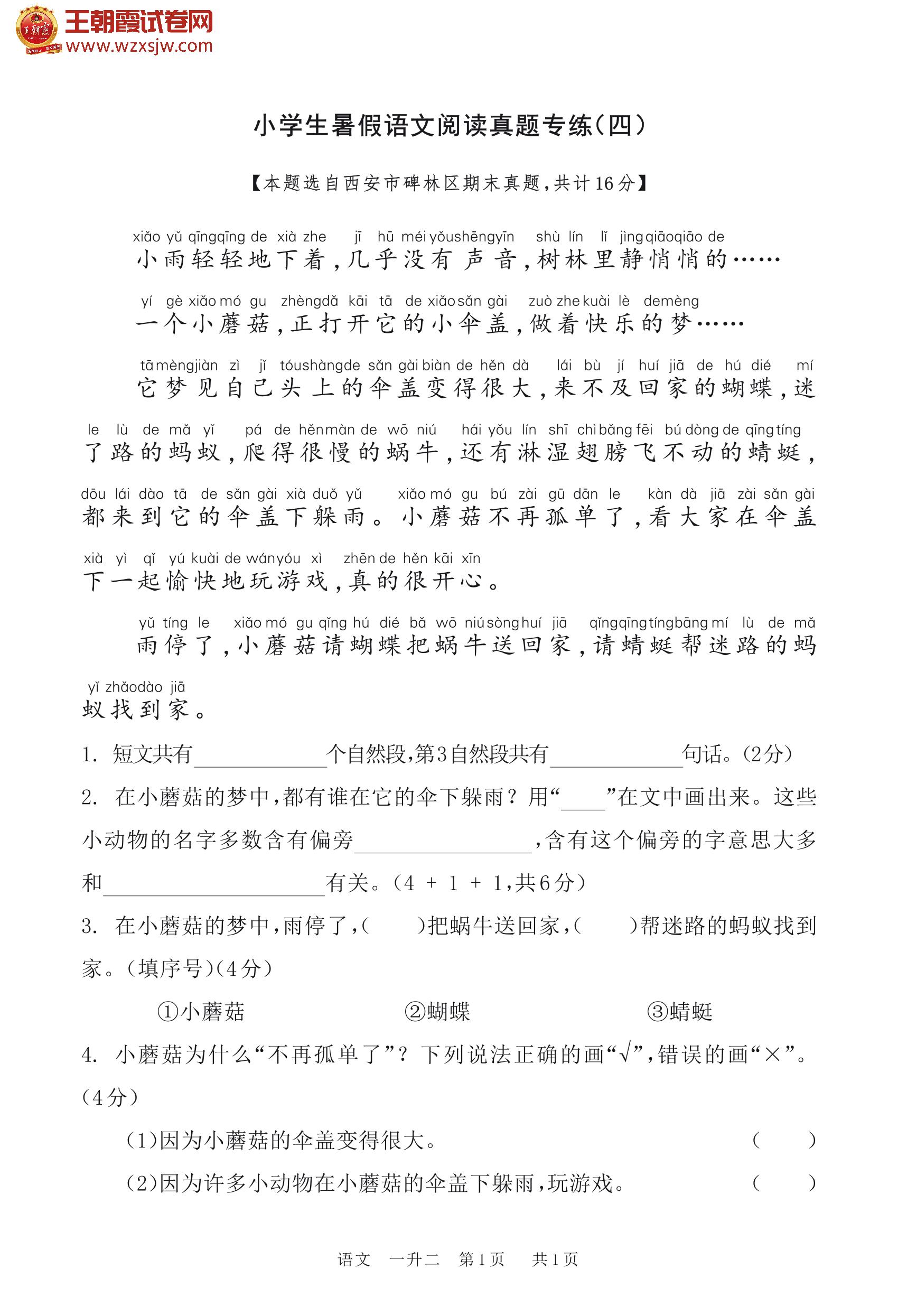 【一升二】小学生暑假语文阅读真题专练(四)