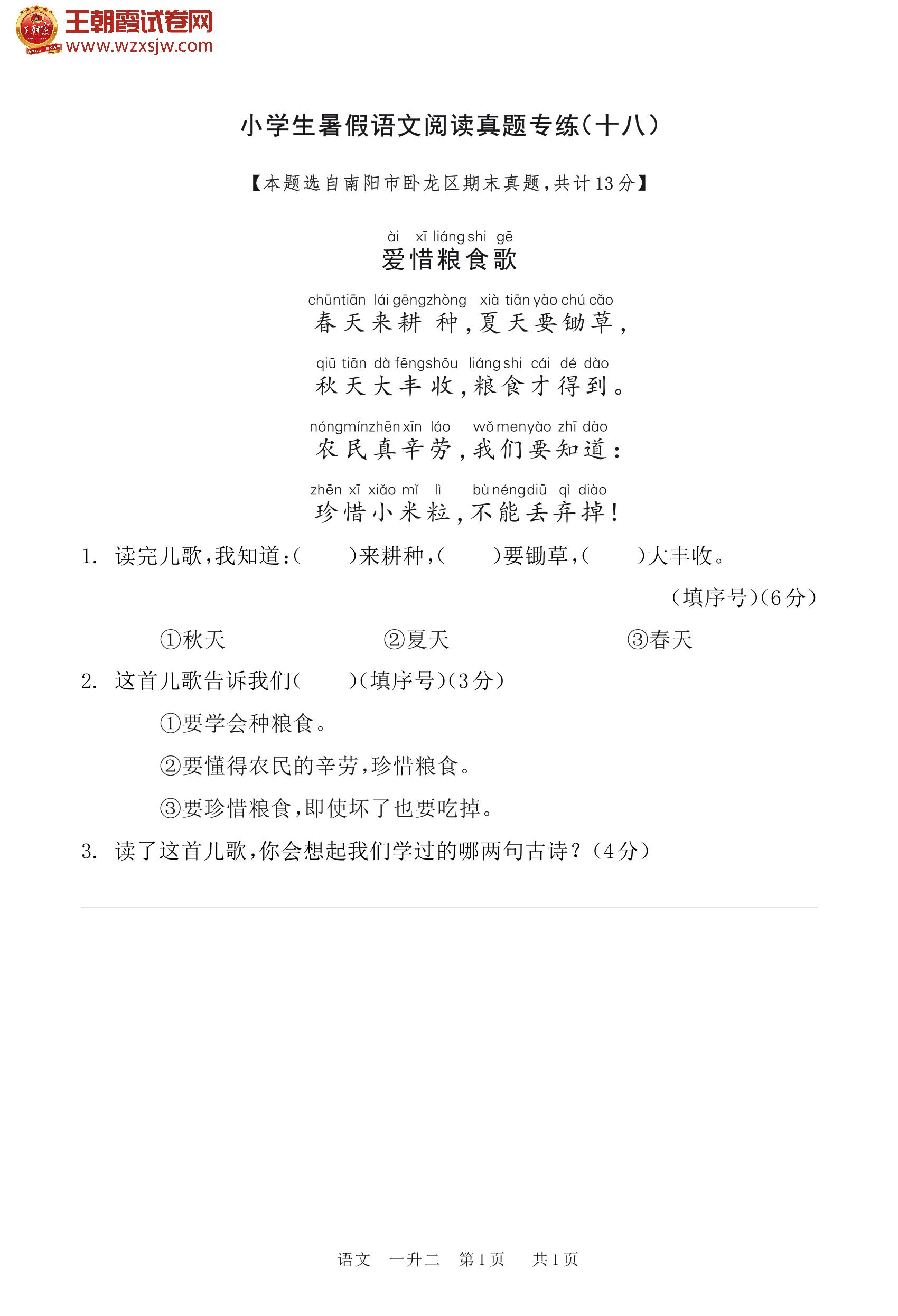 【一升二】小学生暑假语文阅读真题专练(十八)
