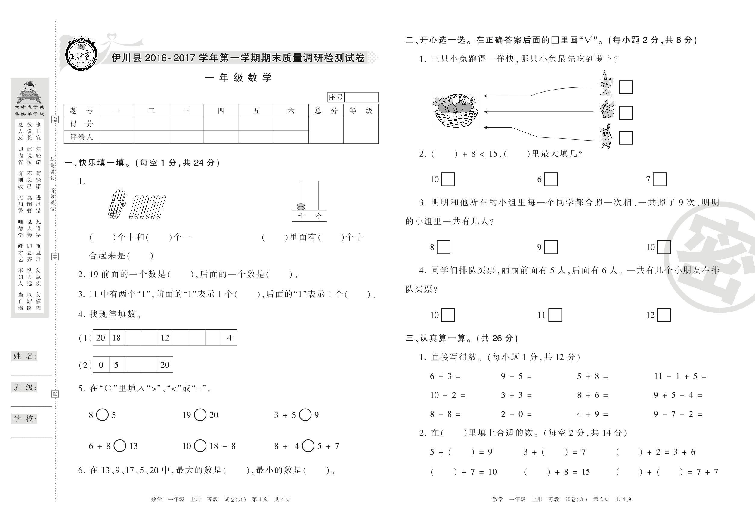 2016-2017学年第一学期洛阳市伊川县一年级数学试卷(苏教版)【9】
