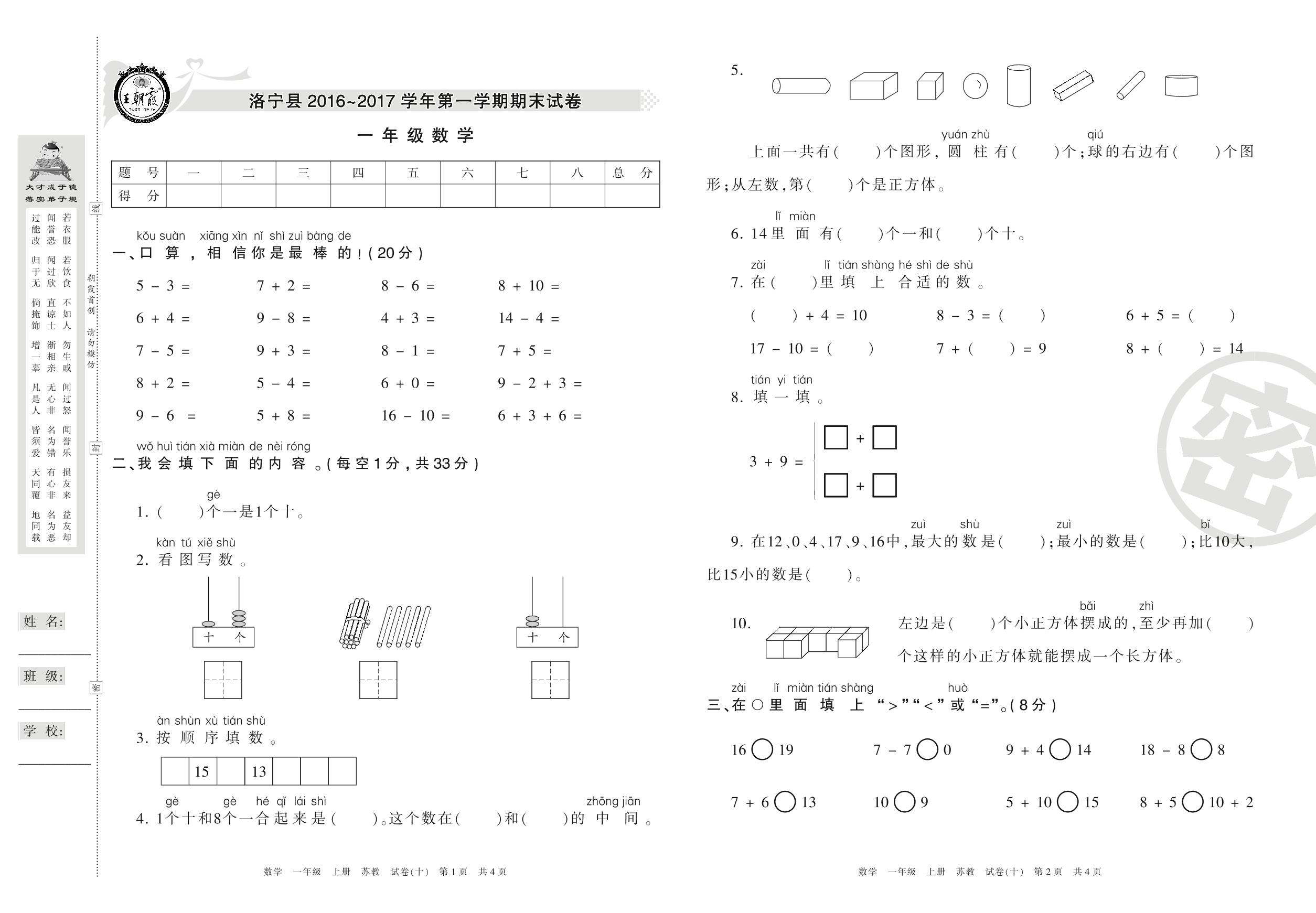 2016-2017学年第一学期洛阳市洛宁县一年级数学试卷(苏教版)【10】