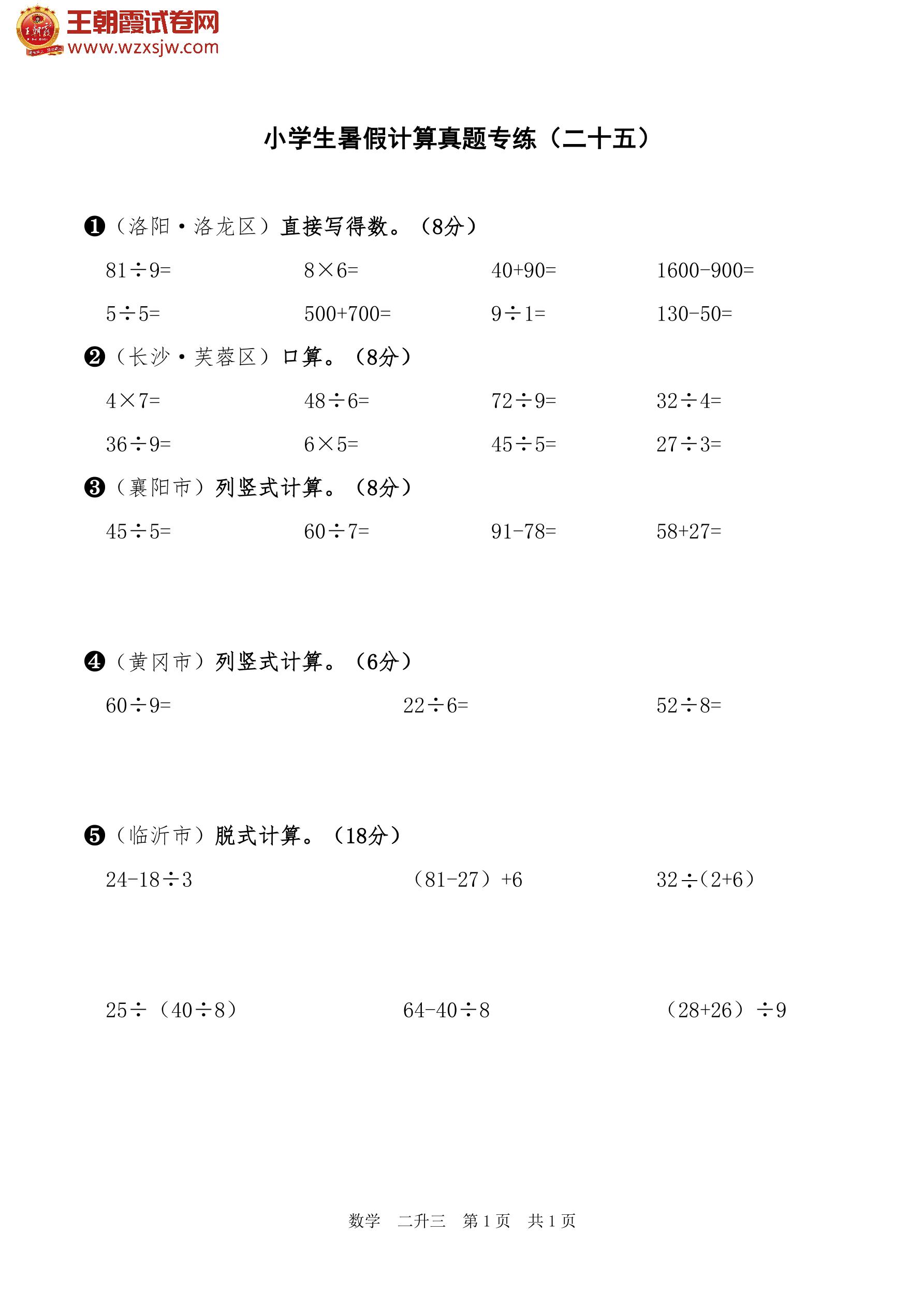 【二升三】小学生暑假计算真题专练(二十五)
