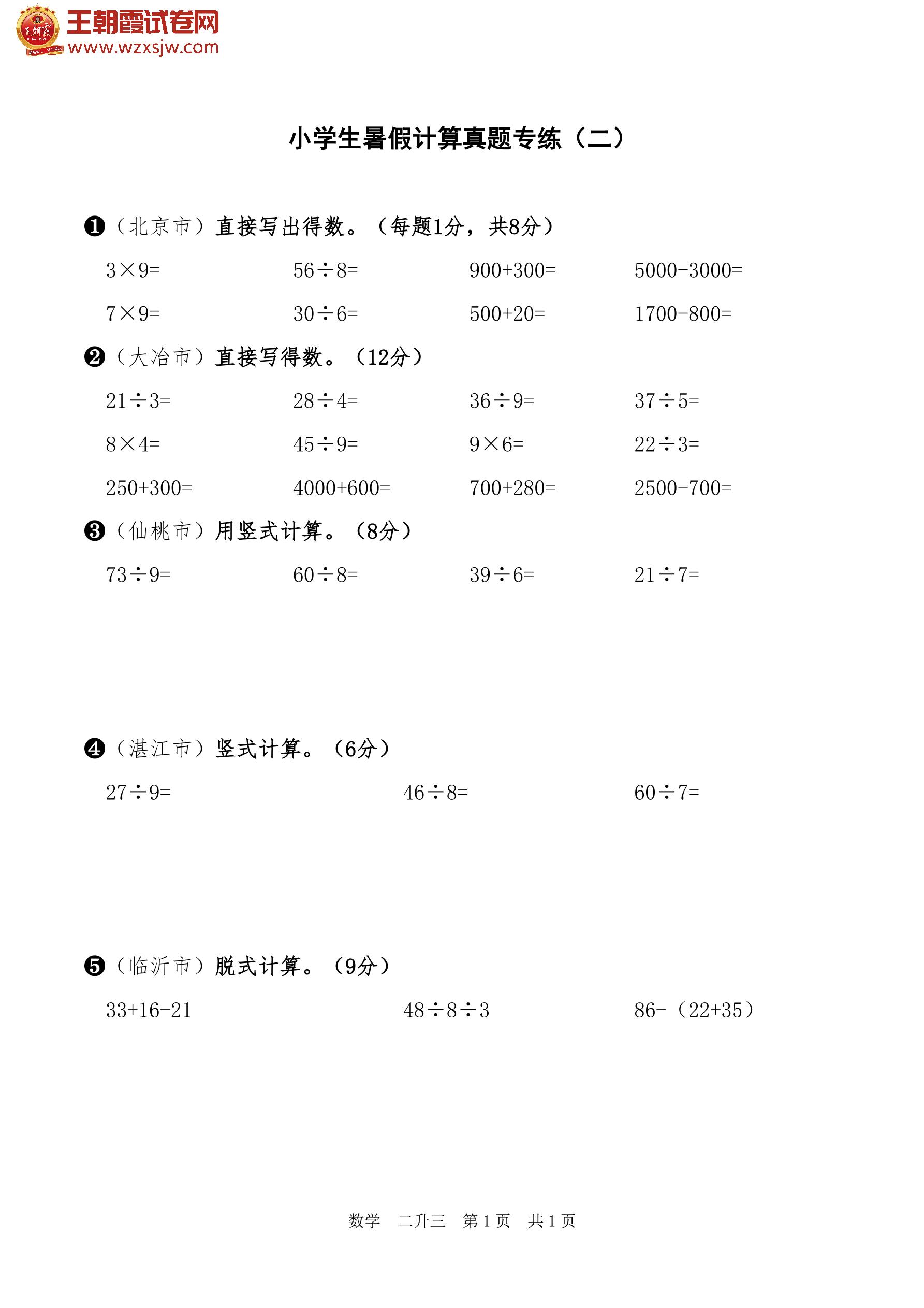 【二升三】小学生暑假计算真题专练(二)
