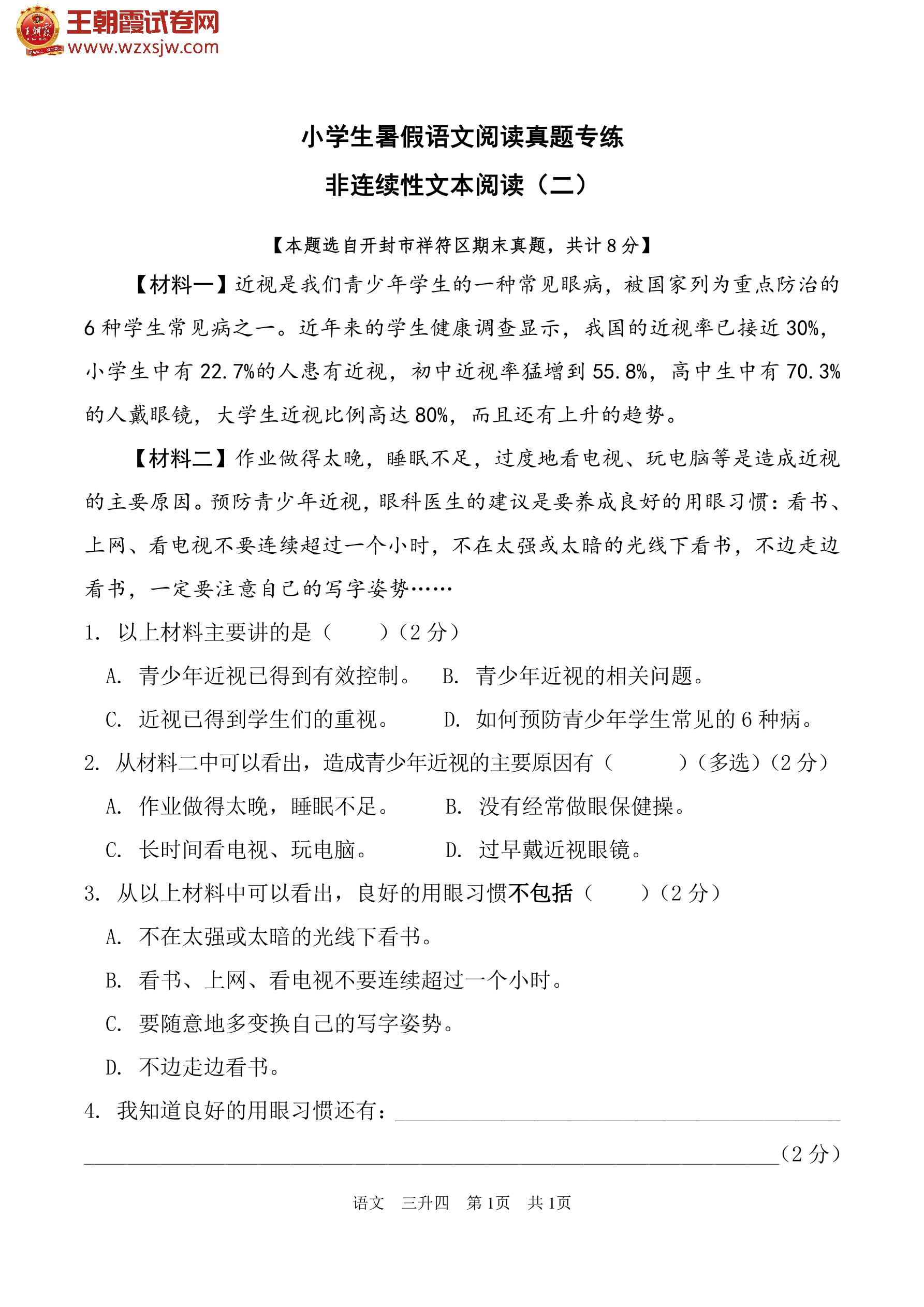 【三升四】小学生暑假语文阅读真题专练——非连续性文本阅读(二)