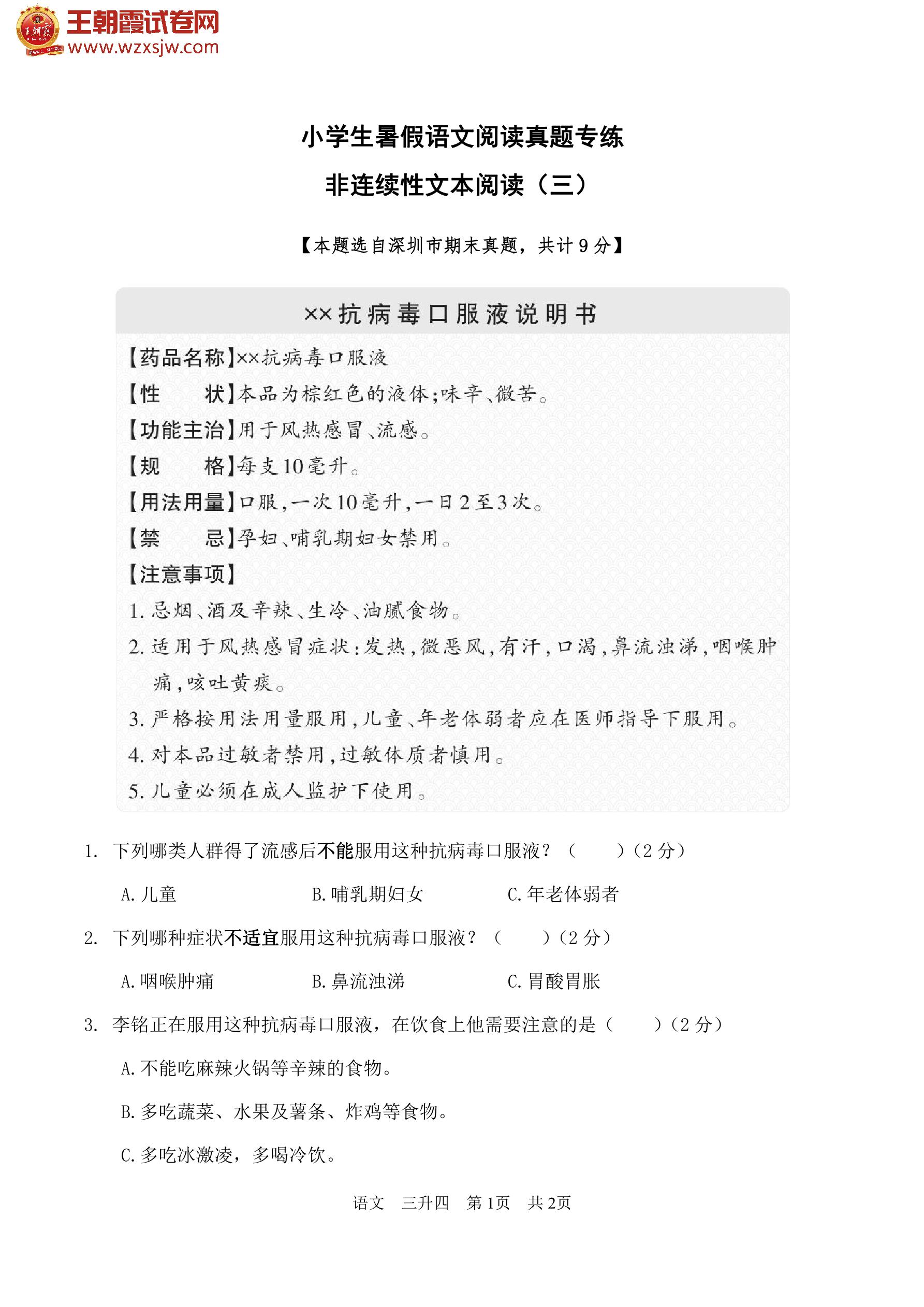 【三升四】小学生暑假语文阅读真题专练——非连续性文本阅读(三)