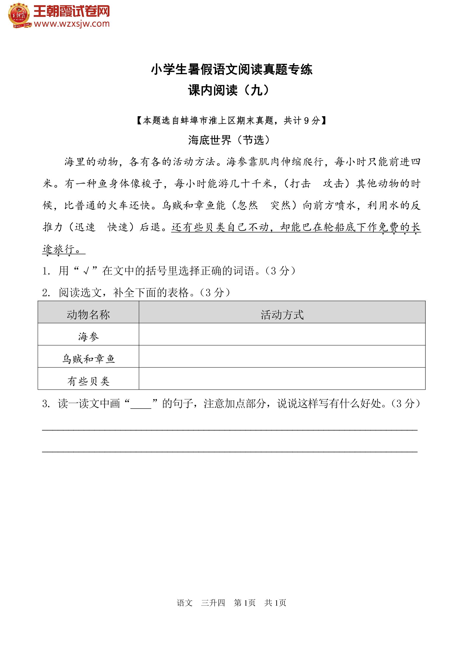 【三升四】小学生暑假语文阅读真题专练——课内阅读(九)