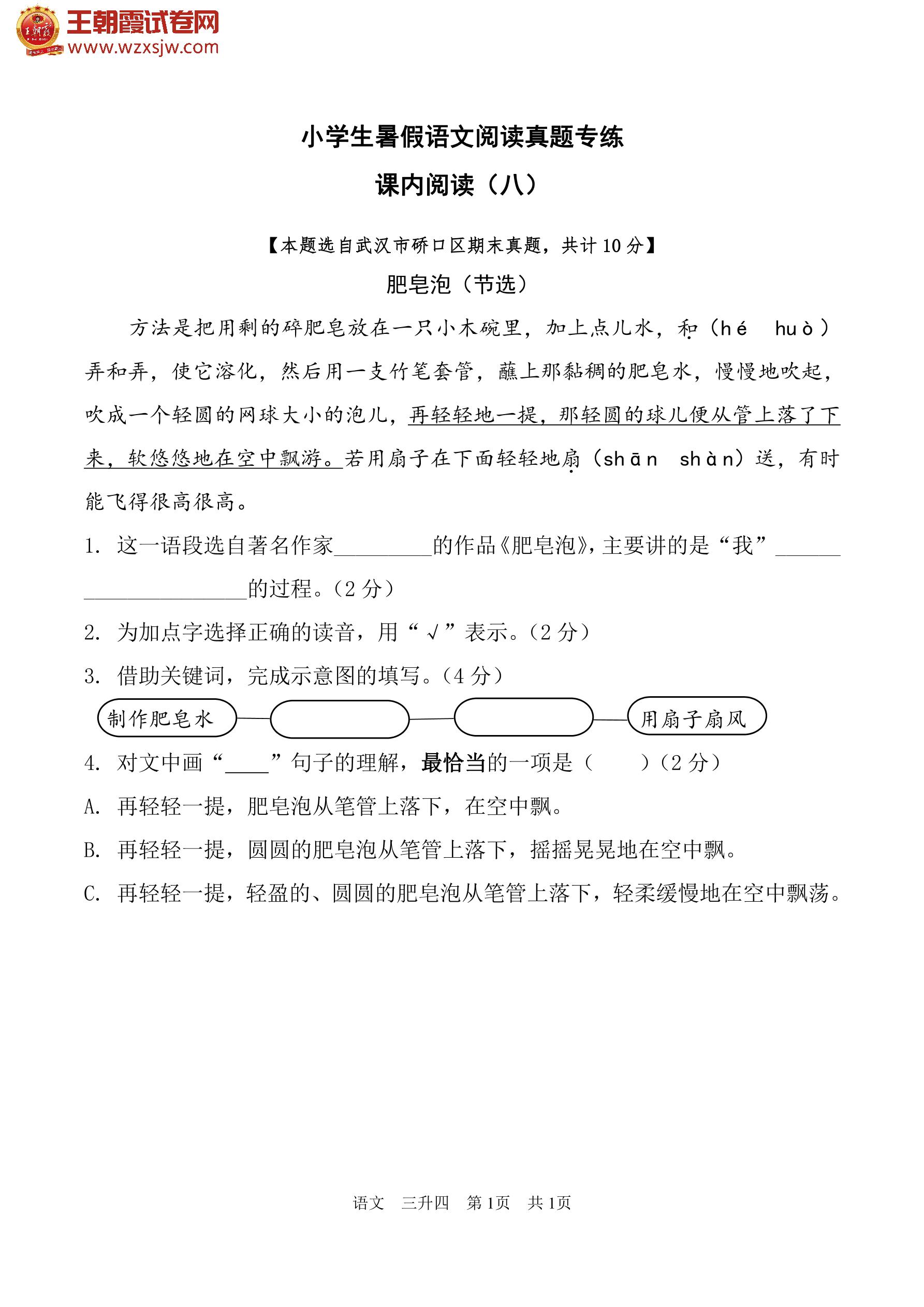 【三升四】小学生暑假语文阅读真题专练——课内阅读(八)