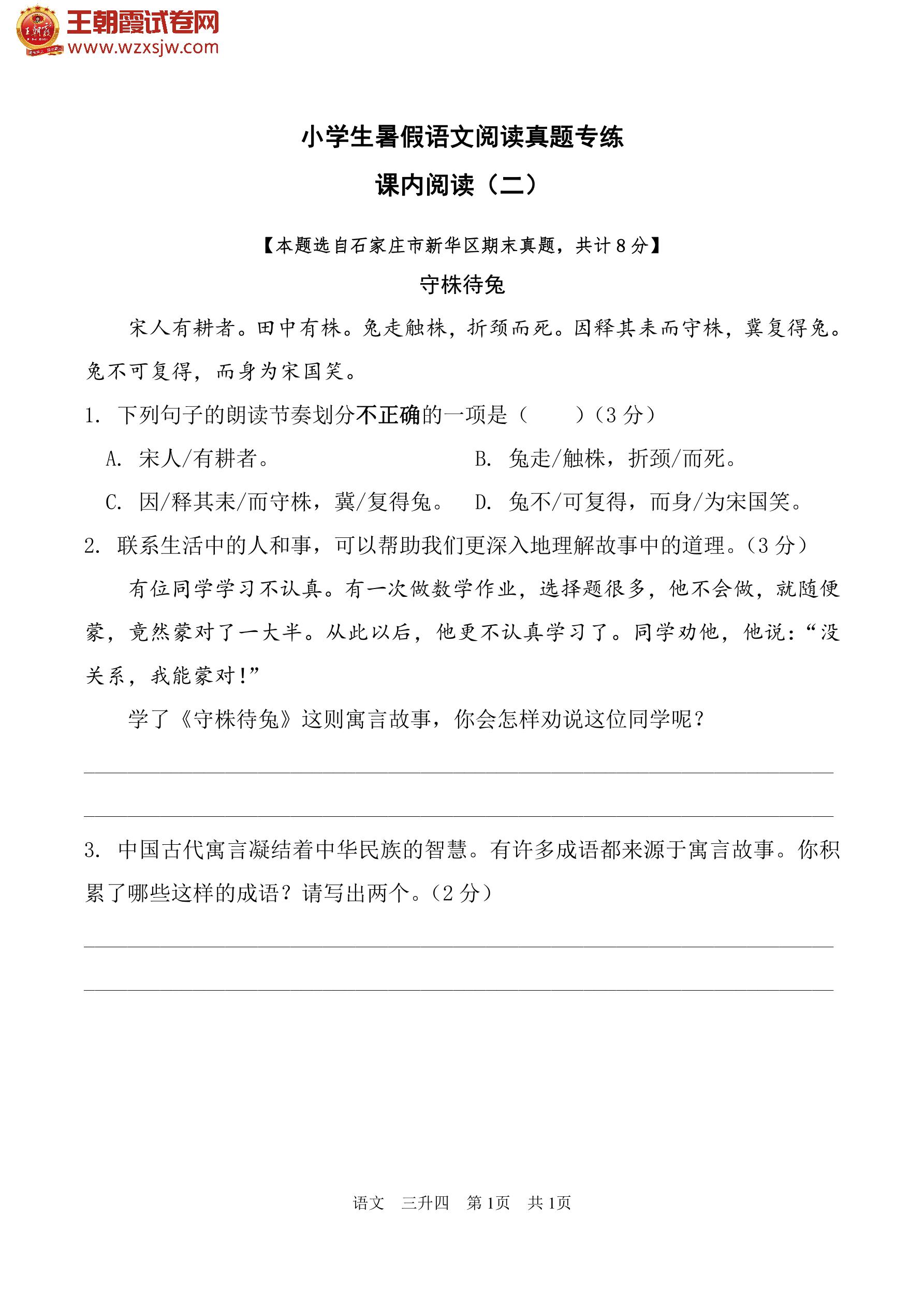 【三升四】小学生暑假语文阅读真题专练——课内阅读(二)