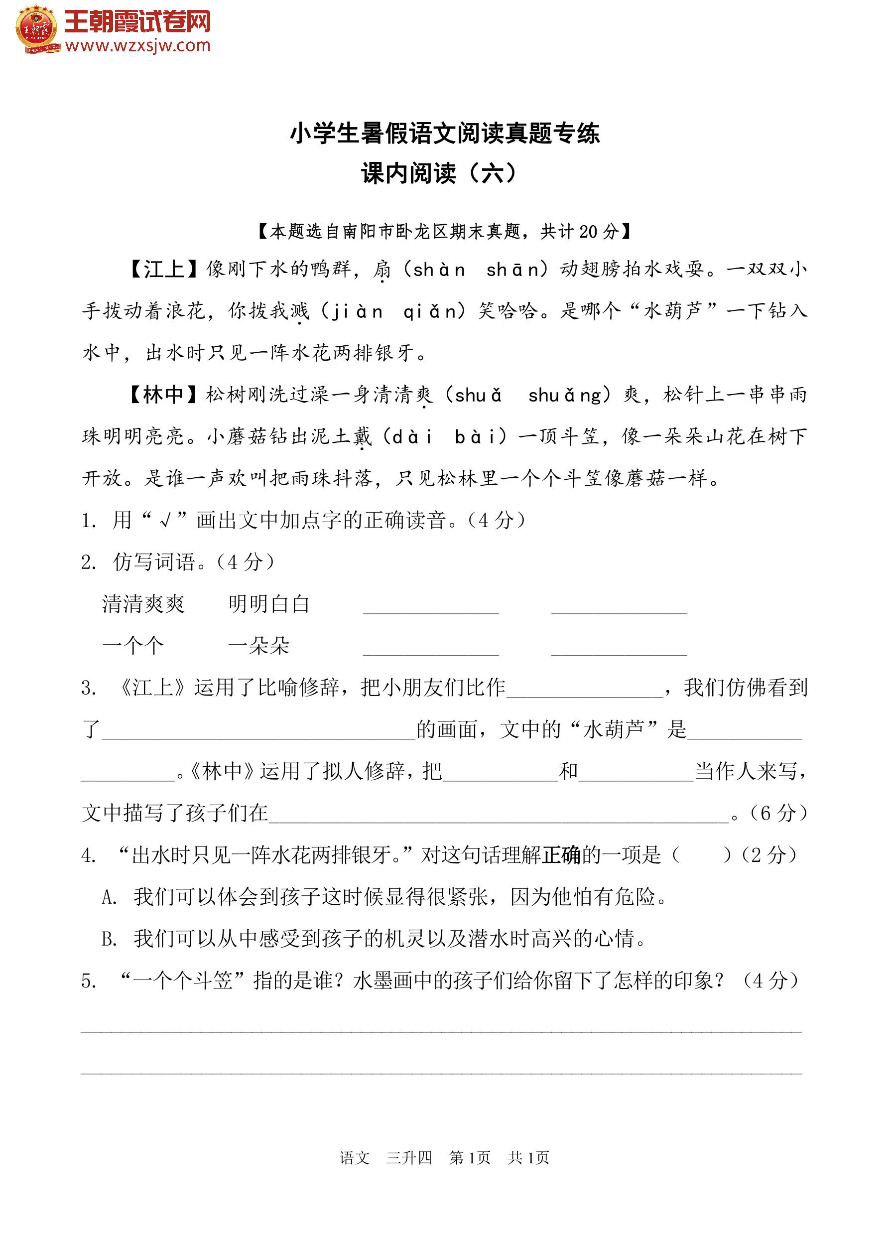 【三升四】小学生暑假语文阅读真题专练——课内阅读(六)