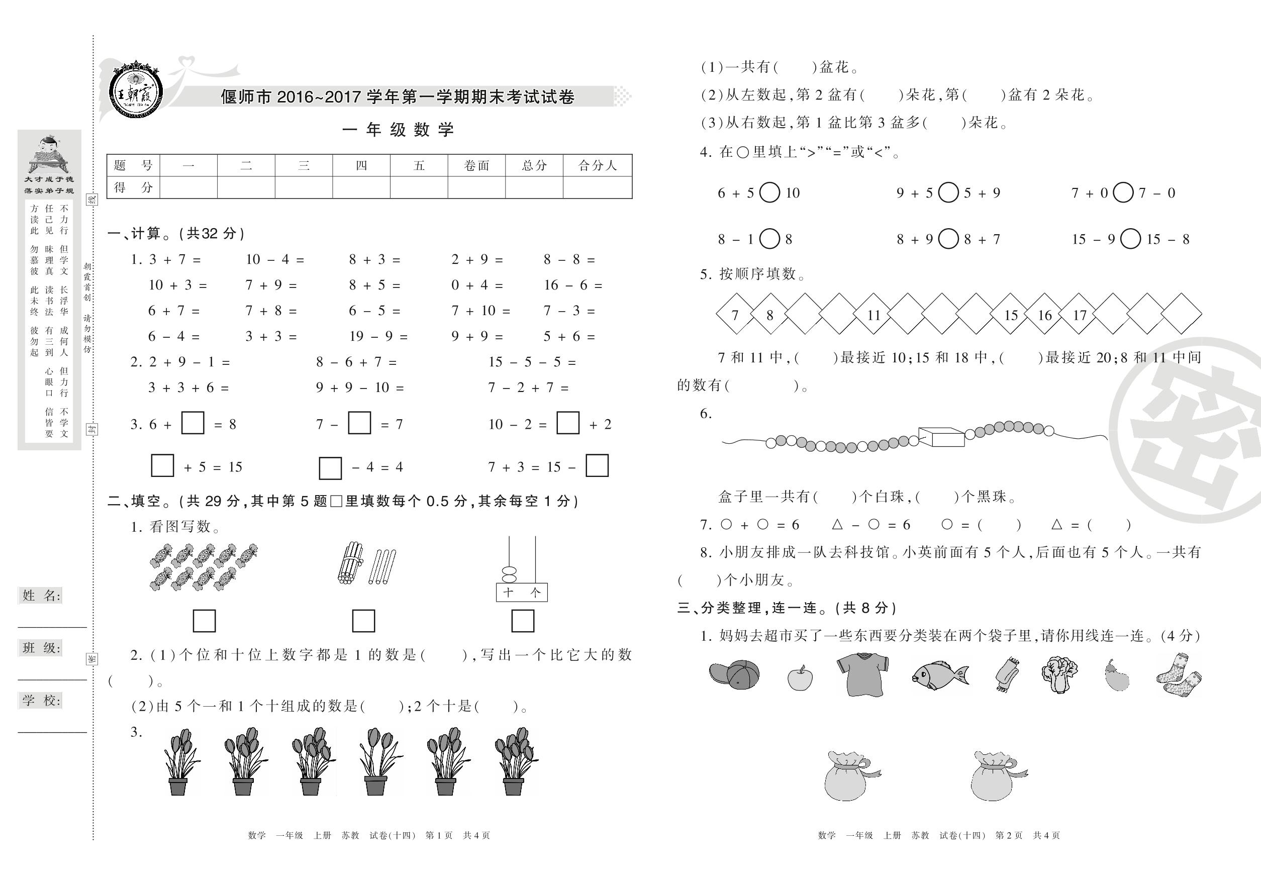 2016-2017学年第一学期偃师市一年级数学试卷(苏教版)【14】
