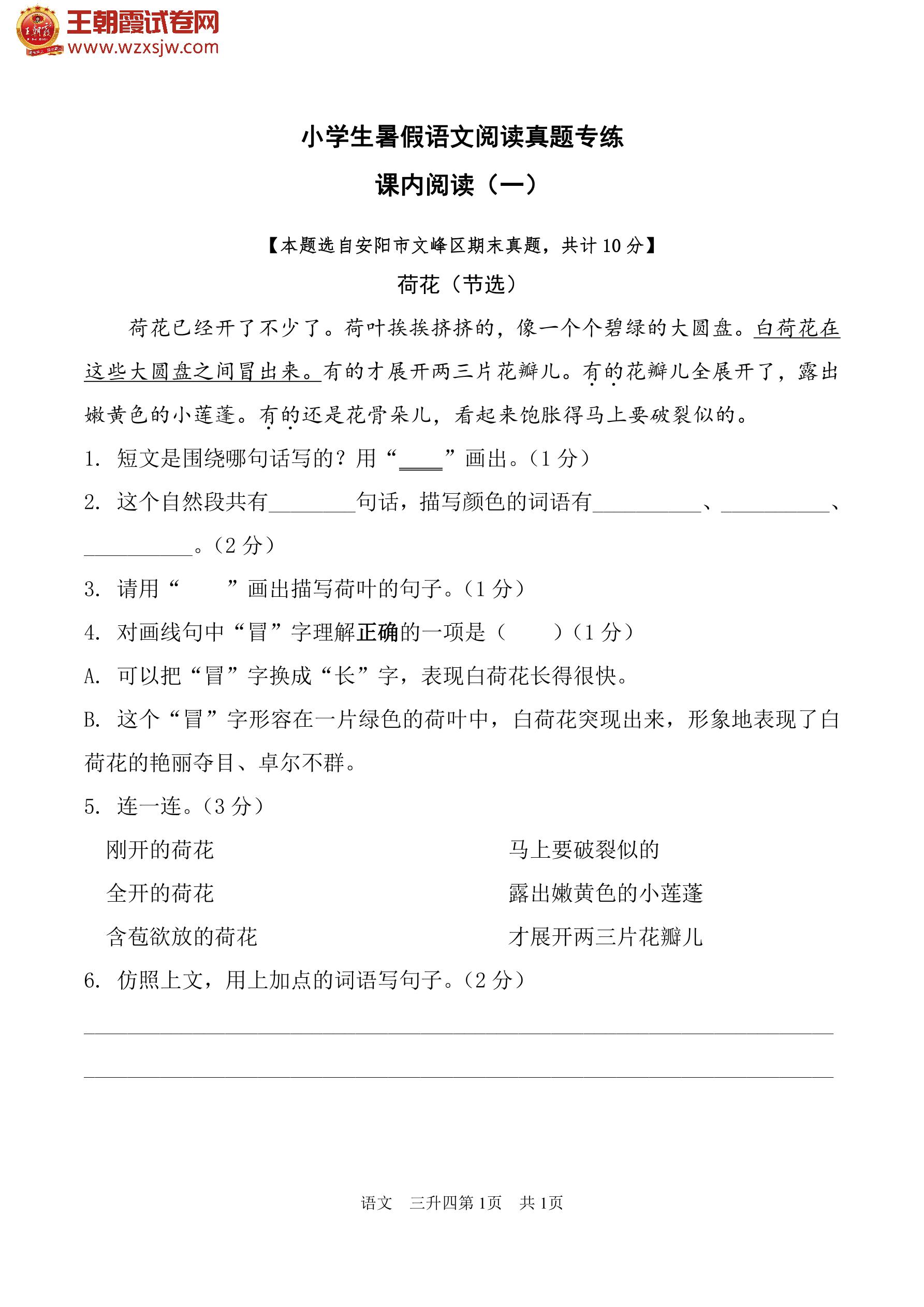 【三升四】小学生暑假语文阅读真题专练——课内阅读(一)