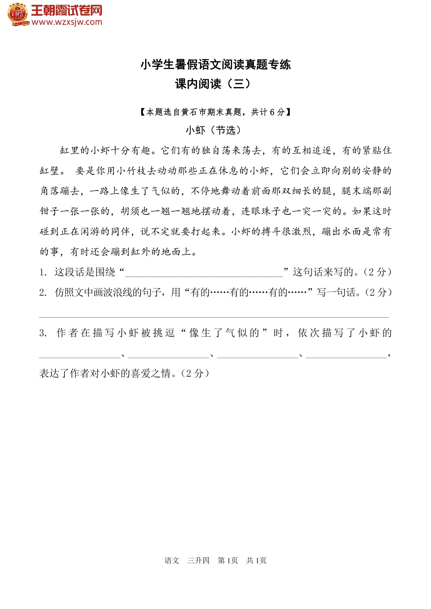 【三升四】小学生暑假语文阅读真题专练——课内阅读(五)