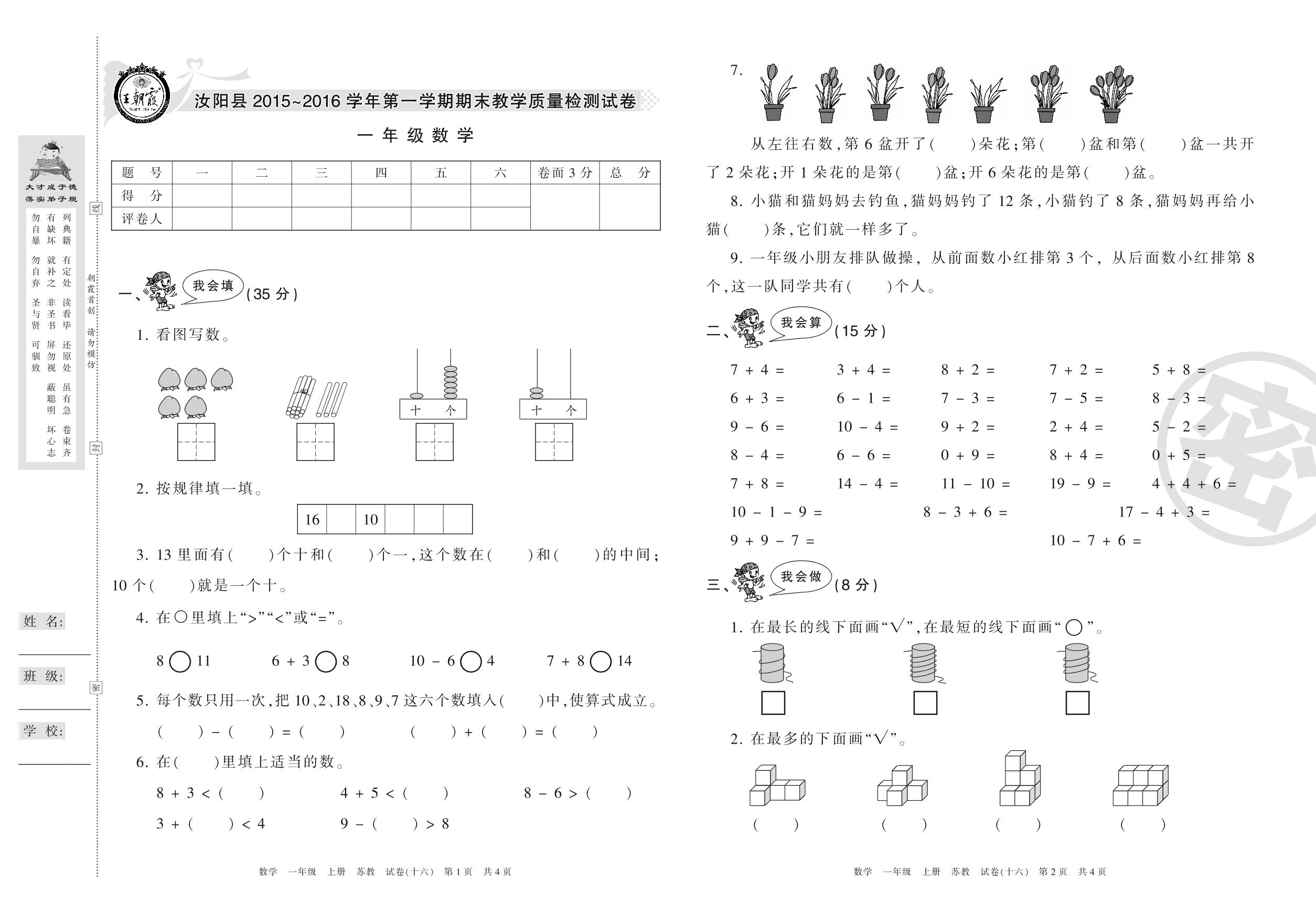 2015-2016学年第一学期洛阳市汝阳县一年级数学试卷(苏教版)【16】