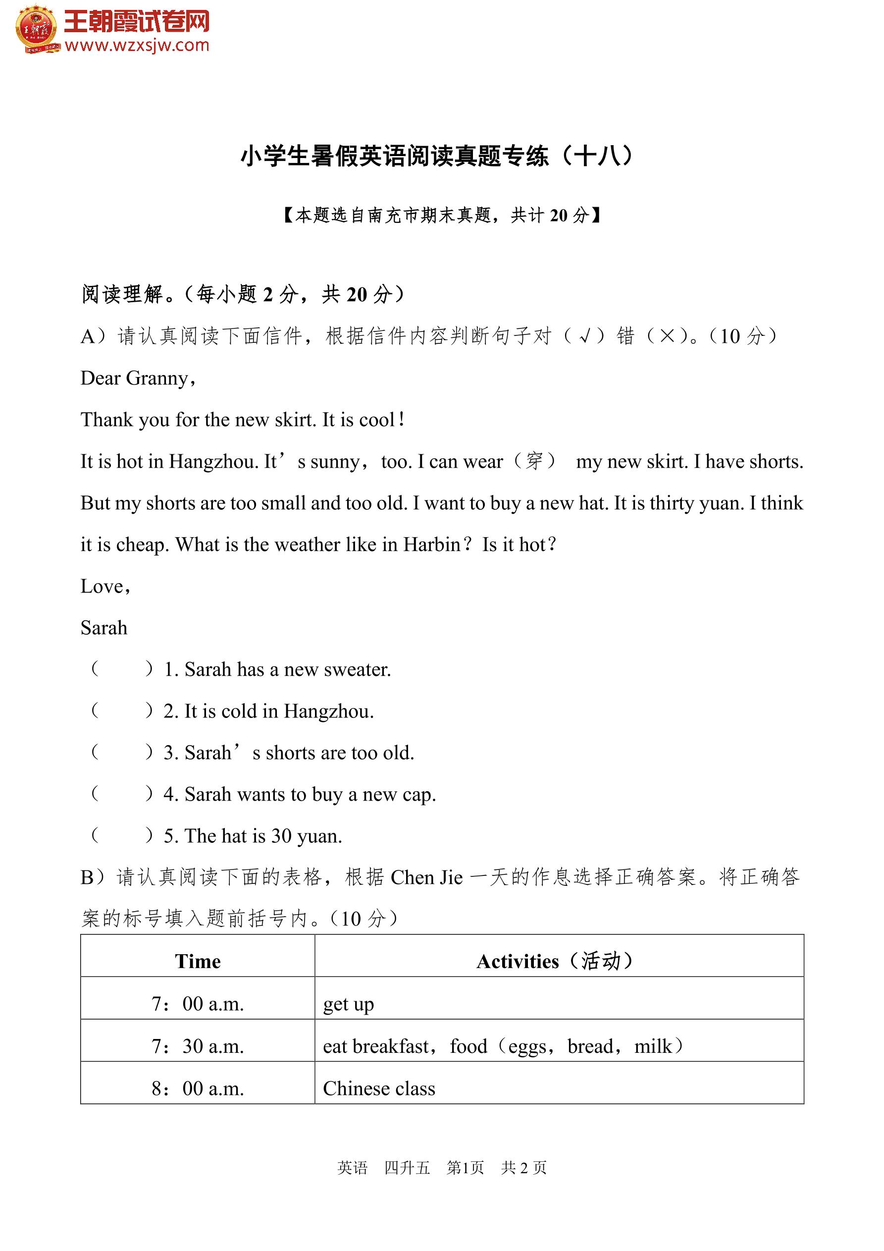 【四升五】小学生暑假英语阅读真题专练(十八)