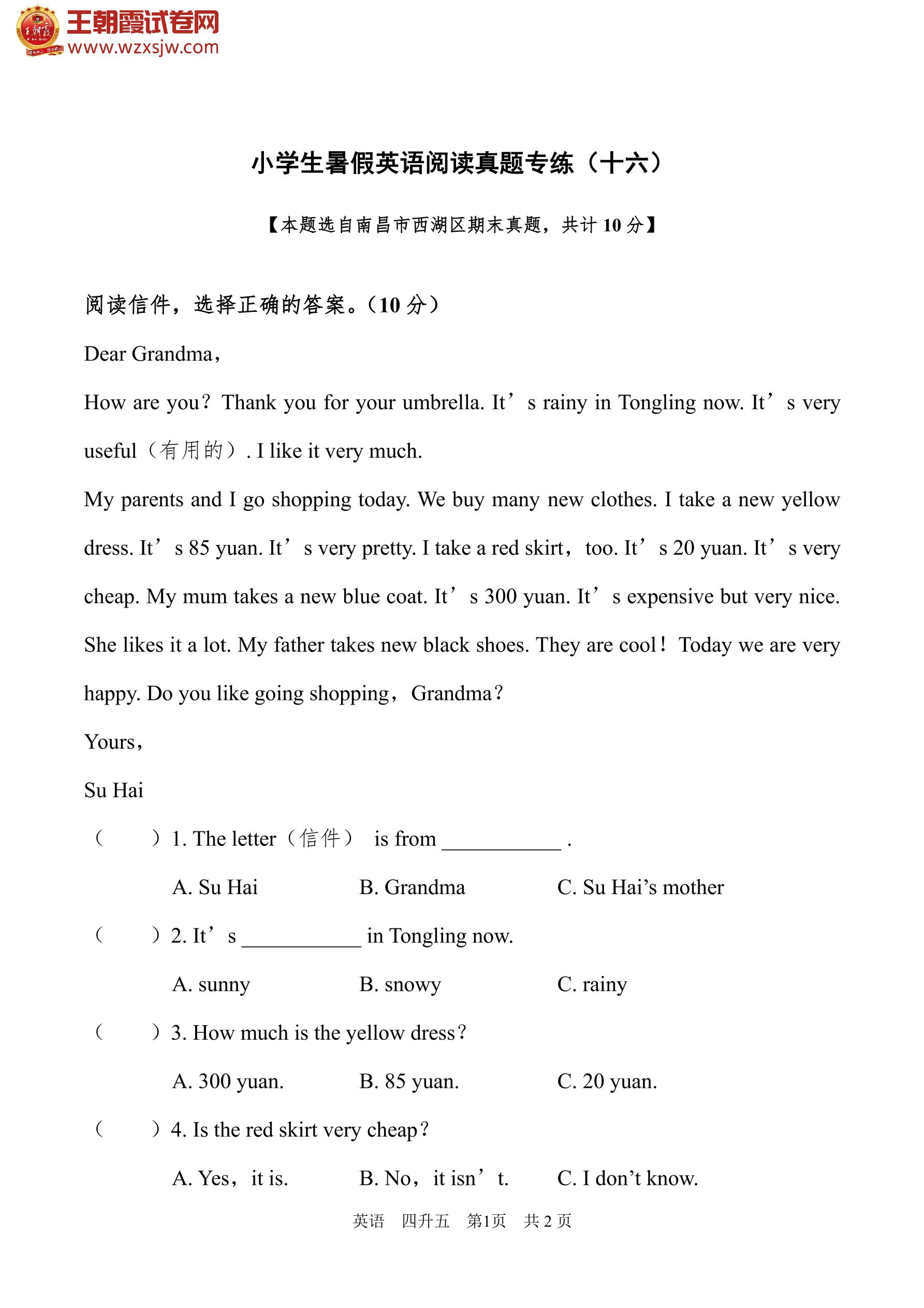【四升五】小学生暑假英语阅读真题专练(十六)