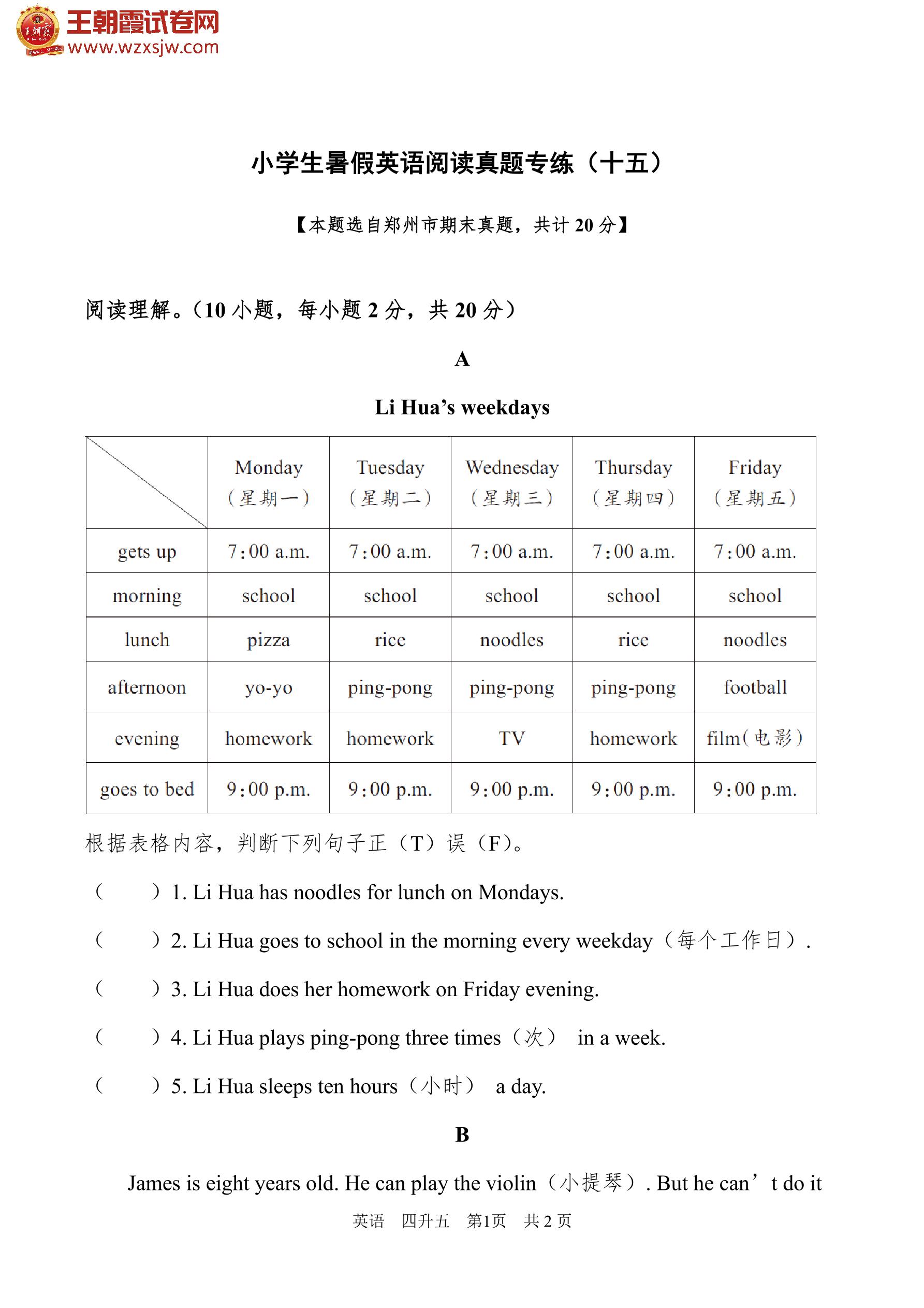 【四升五】小学生暑假英语阅读真题专练(十五)