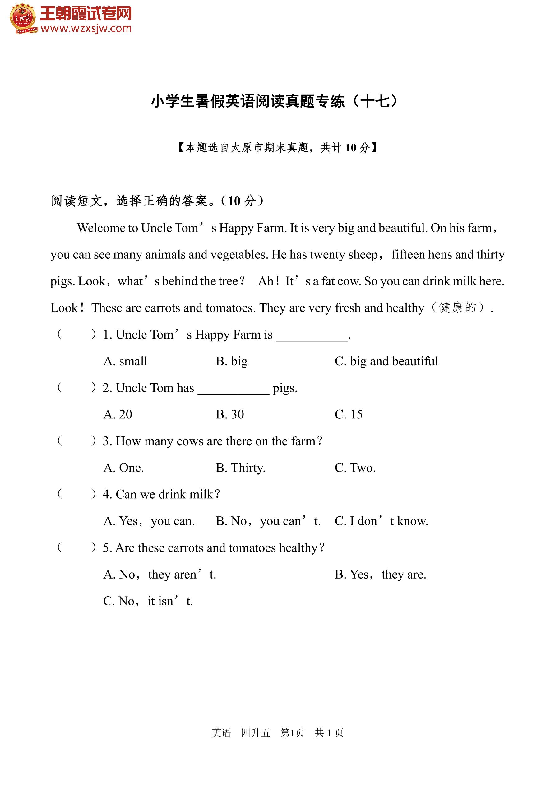 【四升五】小学生暑假英语阅读真题专练(十七)